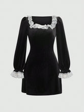 More sizes availableMOD Women'S Lace Patchwork Ruffle Hem Long Sleeve DressColor: Black Style: Elegant Pattern Type: Plain, Colorblock Details: Ruffle, Contrast Lace Neckline: Square Neck Sleeve Length: Long Sleeve Type: Bodycon, Fitted Sleeve Type: Flounce Sleeve, Flare Sleeve Waist Line: High Waist Hem Shaped: Pencil Length: Short Fit Type: Regular Fit Fabric: Medium Stretch...