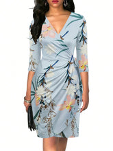 More sizes availableFloral Print Wrap Knot Side DressColor: Blue Style: Boho Pattern Type: Floral Details: Wrap, Ruched, Knot Neckline: V neck Sleeve Length: Three Quarter Length Sleeve Type: Fitted Sleeve Type: Regular Sleeve Waist Line: High Waist Hem Shaped: Wrap Length: Knee Length Fit Type: Slim Fit Fabric: Slight Stretch Material:...