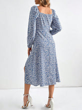 More sizes availableWomen'S Floral Print Square Neckline DressColor: Blue Style: Boho Pattern Type: Ditsy Floral Details: Split Thigh, Tie Front, Ruched Bust Neckline: Square Neck Sleeve Length: Long Sleeve Type: A Line Sleeve Type: Bishop Sleeve Waist Line: High Waist Hem Shaped: Slit Length: Midi Fit Type: Slim Fit Fabric: Slight...