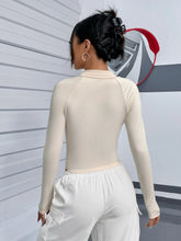 Letter Graphic Contrast Panel Raglan Sleeve Crop Tee - BeigeQuantity: 1 piece Color: Beige Style: Casual Pattern Type: Letter, Colorblock Neckline: Collar Details: Zipper Sleeve Length: Long Sleeve Sleeve Type: Raglan Sleeve Length: Crop Fit Type: Slim Fit Fabric: High Stretch Material: Polyester Composition: 90% Polyester, 10% Elastane Care Instructions: Machine wash or...