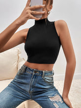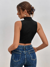 Mock Neck Crop Tank Top - BlackQuantity: 1 piece Color: Black Style: Casual Pattern Type: Plain Details: Rib-Knit Type: Tank Neckline: Stand Collar Length: Crop Fit Type: Slim Fit Fabric: High Stretch Material: Polyester Composition: 95% Polyester, 5% Elastane Care Instructions: Hand wash,do not dry clean Sheer: No Model is...