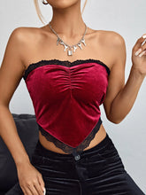 Ruched Bust Contrast Lace Bandana Velvet Top - BurgundyQuantity: 1 piece Color: Burgundy Style: Glamorous Pattern Type: Colorblock Neckline: Strapless Sleeve Length: Sleeveless Details: Asymmetrical, Contrast Lace, High Low, Ruched Bust Hem Shaped: Asymmetrical Length: Crop Fit Type: Slim Fit Fabric: Slight Stretch Material: Velvet Composition: 95% Polyester, 5% Elastane Care Instructions:...