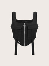 More sizes availableZip Up Flap Pocket Tank Top Without ShirtQuantity: 1 piece Color: Black Style: Casual Pattern Type: Plain Details: Asymmetrical, Pocket, Ring, Zipper Type: Tank Neckline: Straps Hem Shaped: Asymmetrical Length: Crop Fit Type: Slim Fit Fabric: Non-Stretch Material: Woven Fabric Composition: 100% Polyester Care Instructions: Machine wash or professional dry clean...