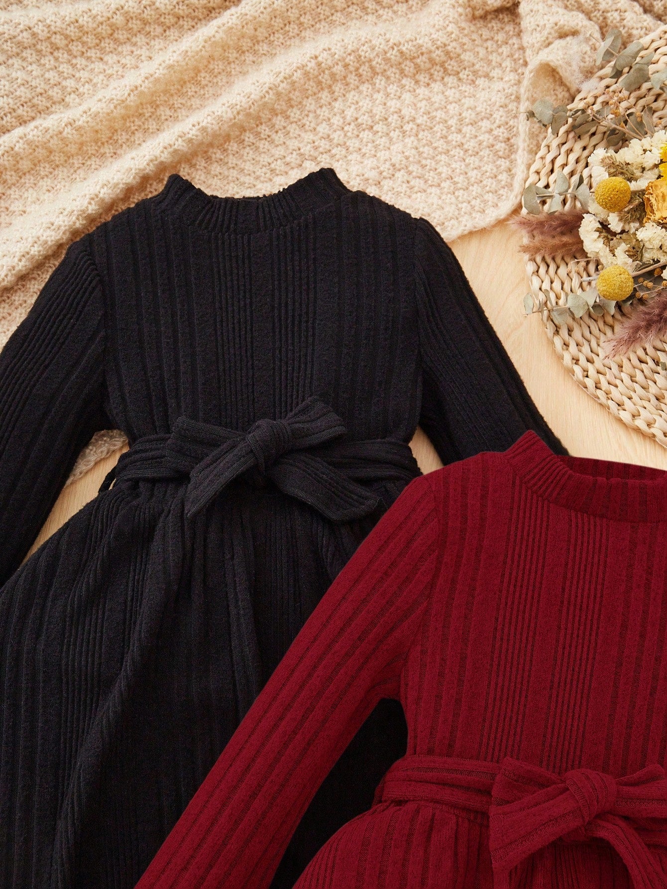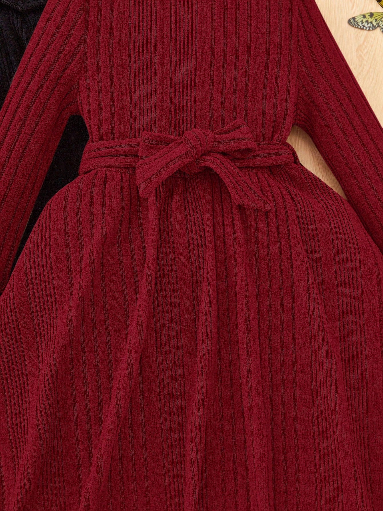 2pcs Girls Young Fashion Elegant Solid Color Stand Collar Long Sleeve Dress Set