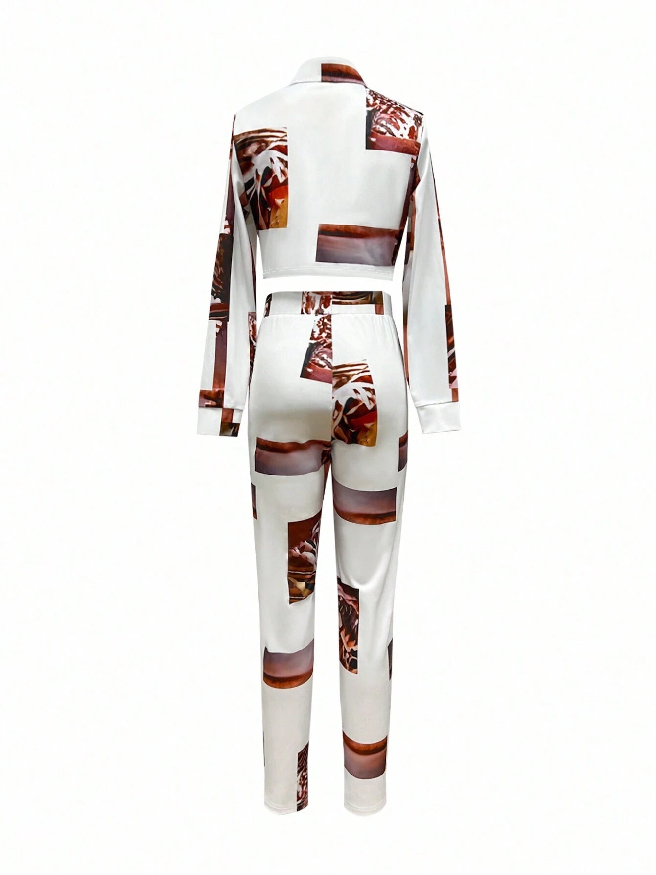 2pcs Women's Casual Random Print Front Button Long Sleeve Blouse And Pocket Decorated Long Pants Set