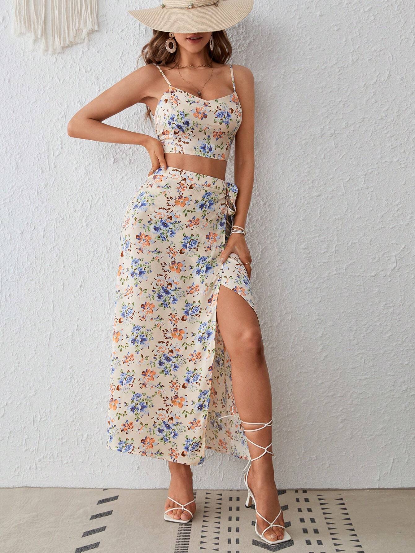 Allover Floral Print Cami Top & Wrap Knot Side Split Thigh Skirt