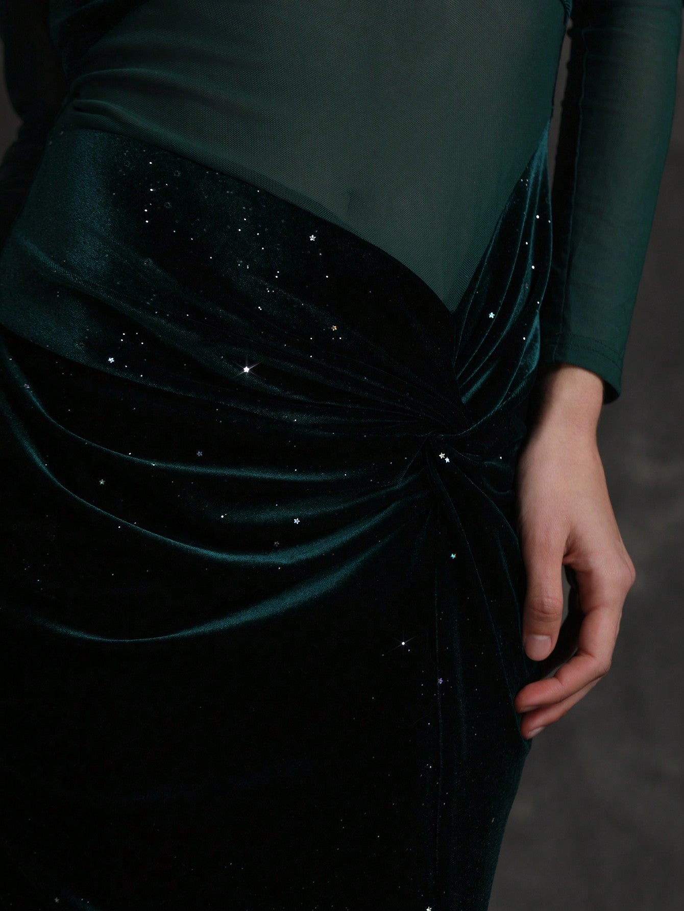 Color: Dark Green Style: Sexy Pattern Type: Plain Details: Sheer, Twist, Split Thigh Neckline: Round Neck Sleeve...