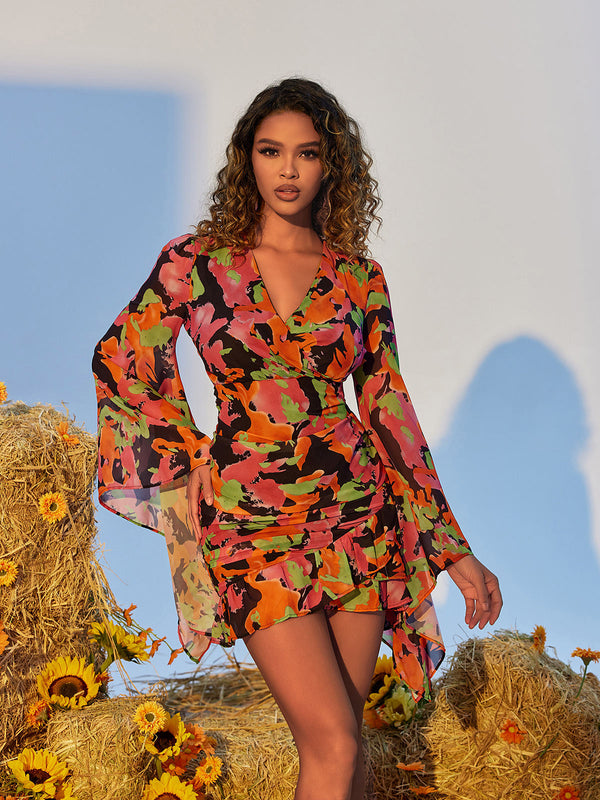 Experience elegance and fun with the Apolline Printed Ruffle Mesh Dress. It features a gathered neckline, sheer mesh ruffles, and a bold, colorful design for a perfect balance of style and femininity. This dress is sure to make a statement, no matter the occasion.