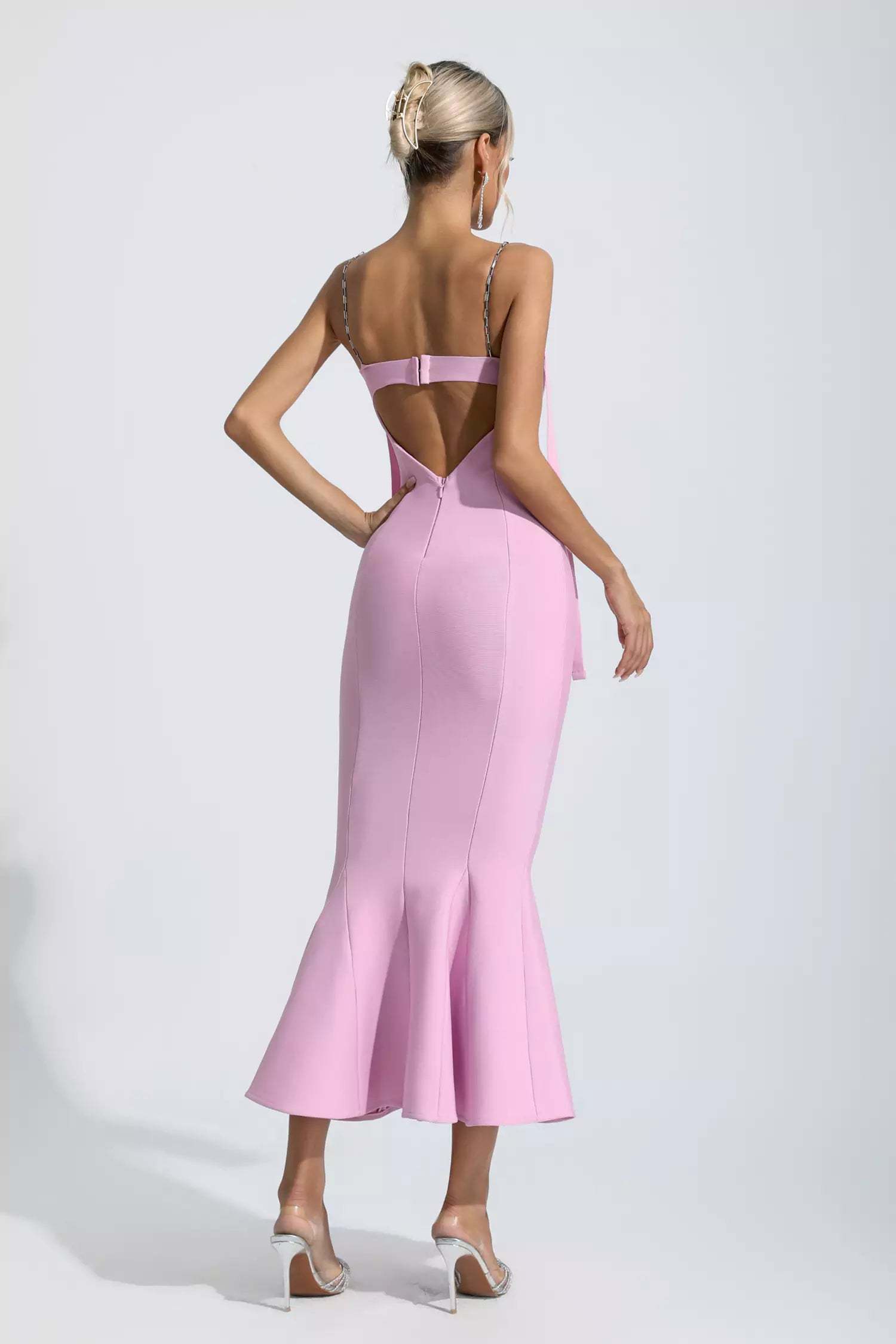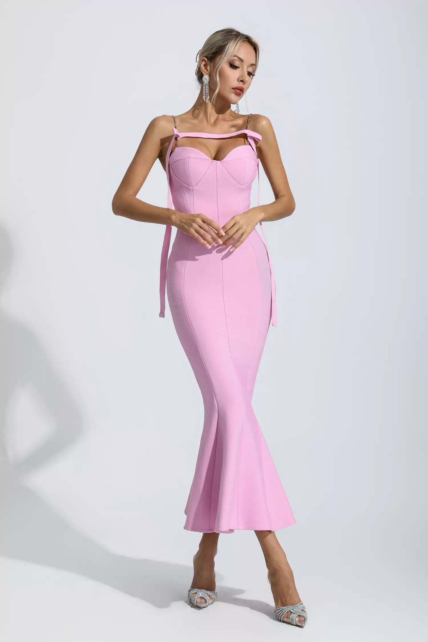 For a weekend night, go bold and elegant in our Averie Pink Bandage Maxi Dress. The bandage fabric is stretchy for a slim fit. With chain suspenders, strappy ties, and a mermaid skirt, this midi dress is fashion-forward. Wear it with heels and a tote for a cocktail party or night out.