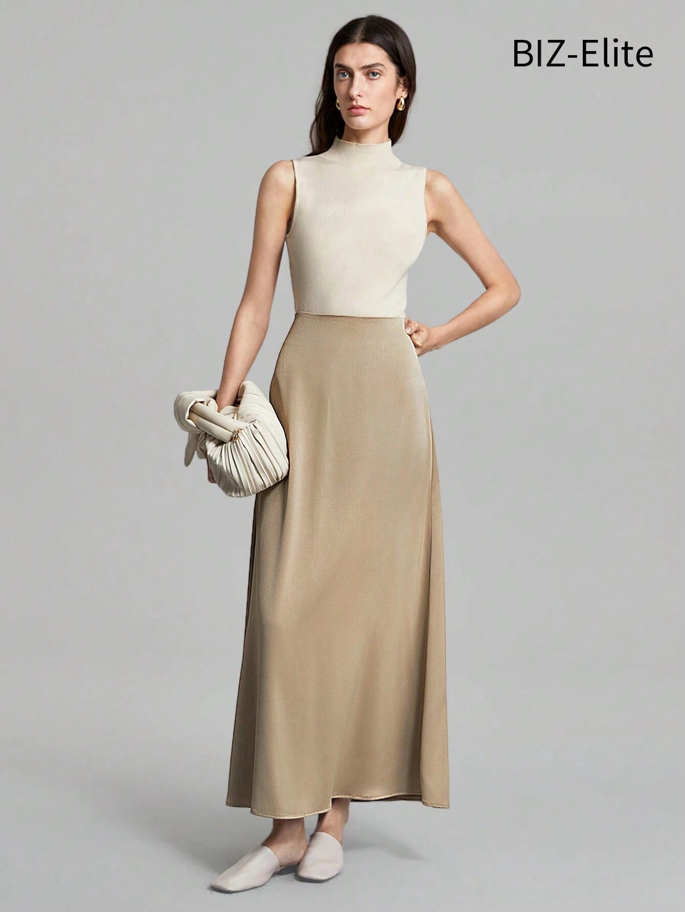 BIZwear Women's High Waist Satin Feeling Khaki Color Solid Color Pleated Skirt