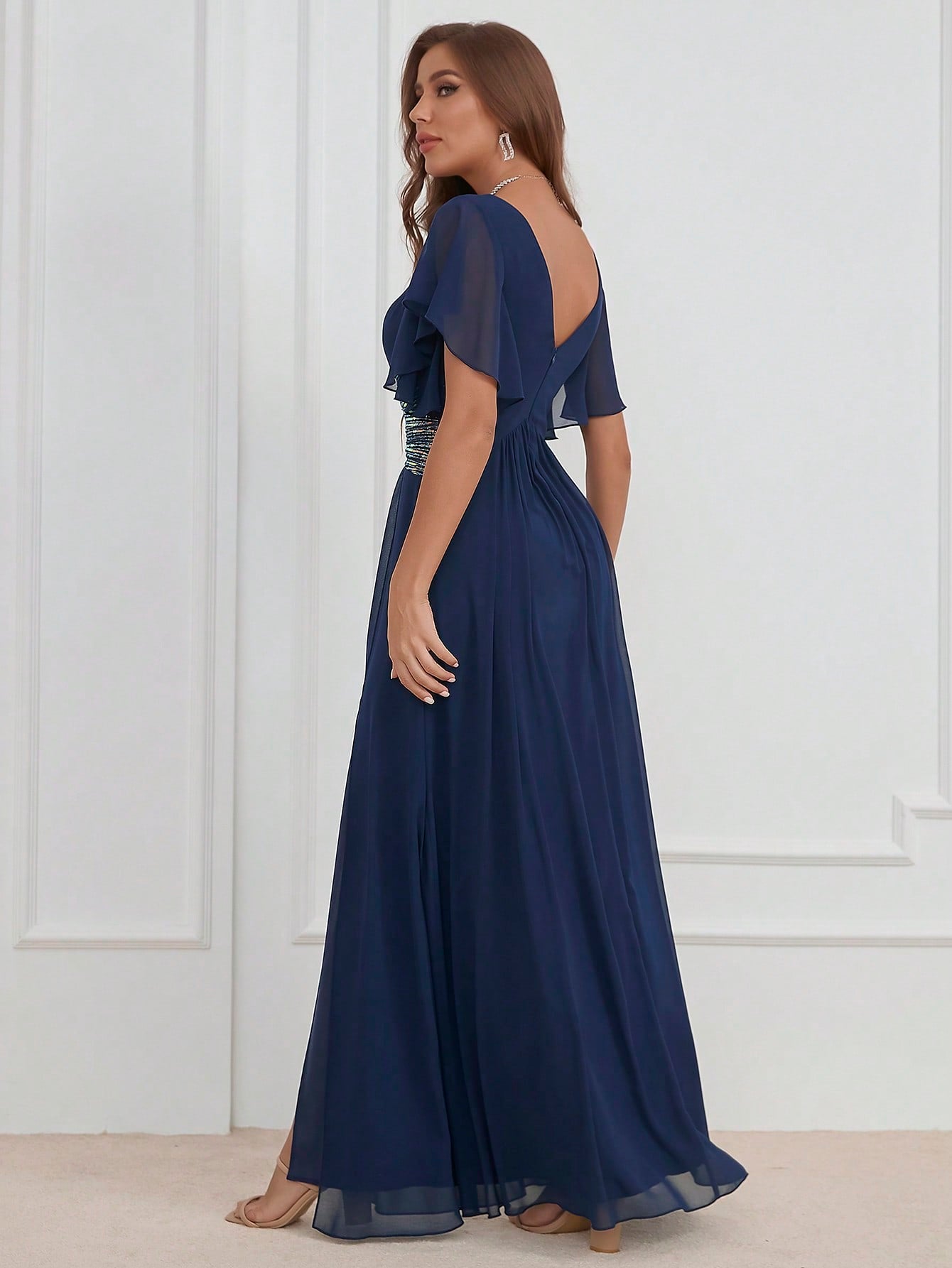 Contrast Sequin Butterfly Sleeve Split Thigh Chiffon Party Bridesmaid Dress