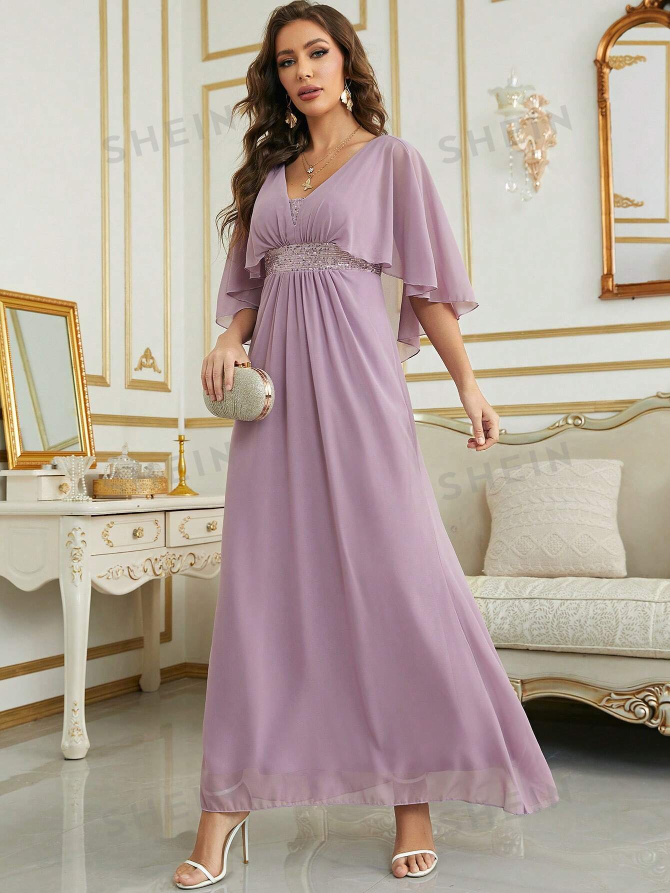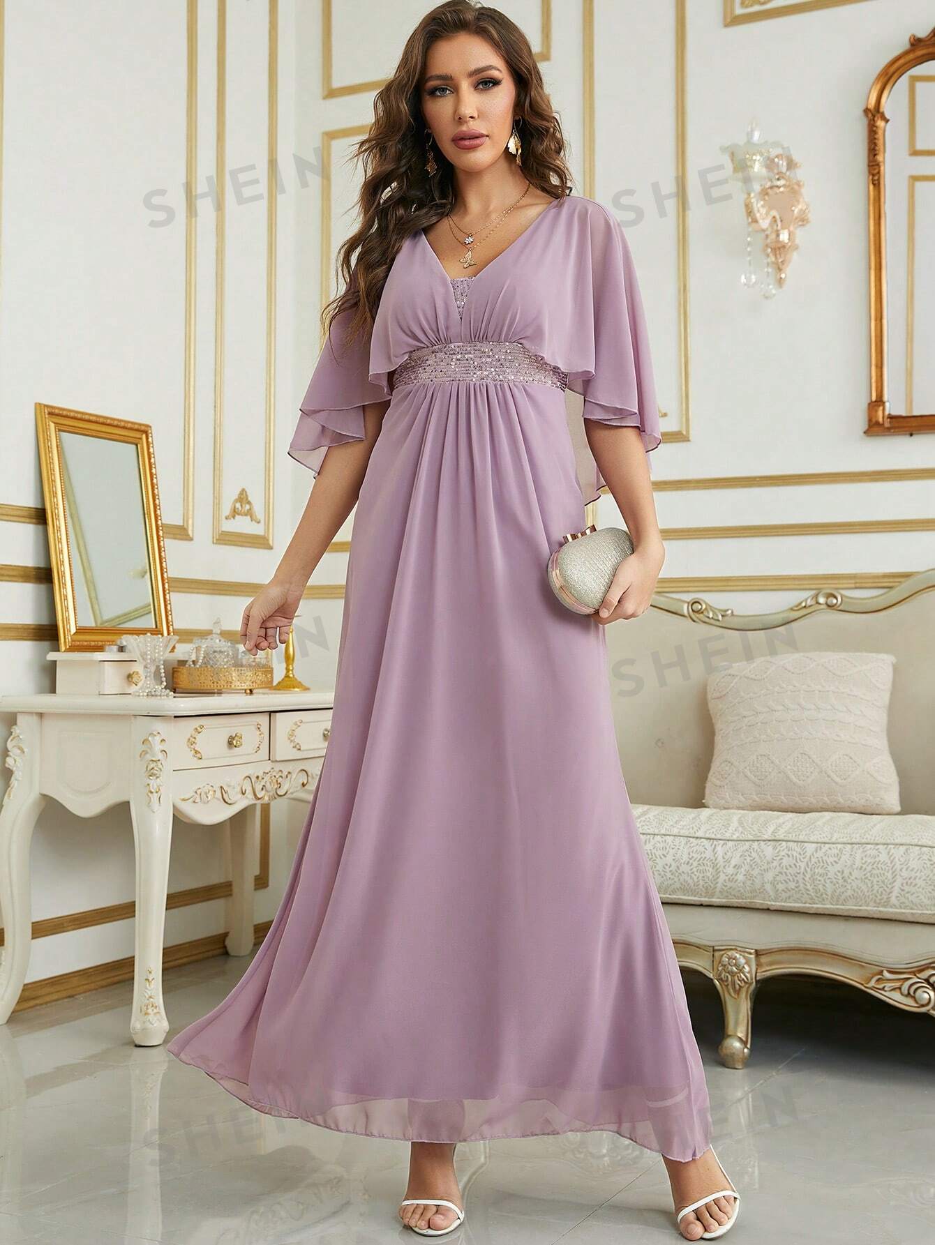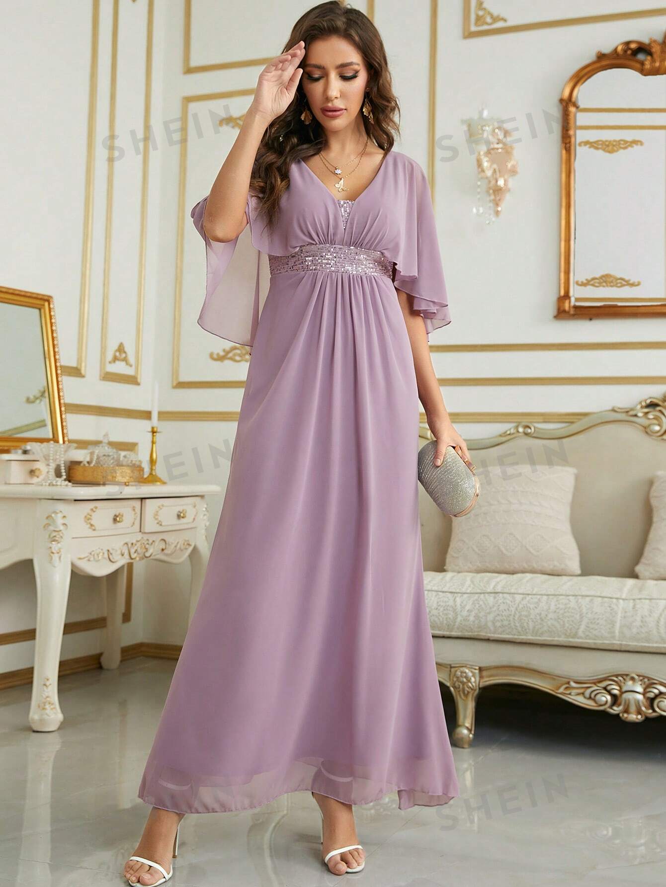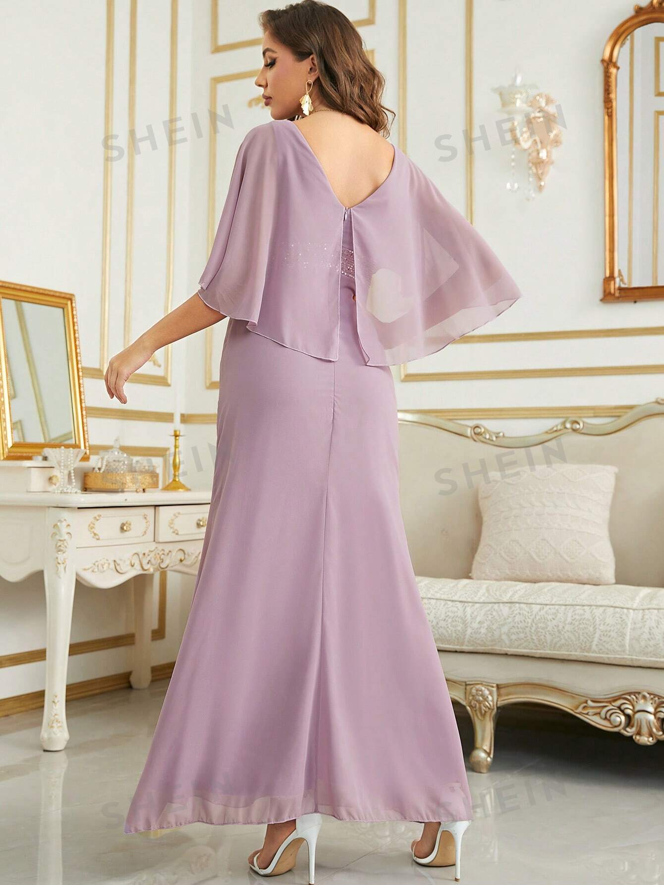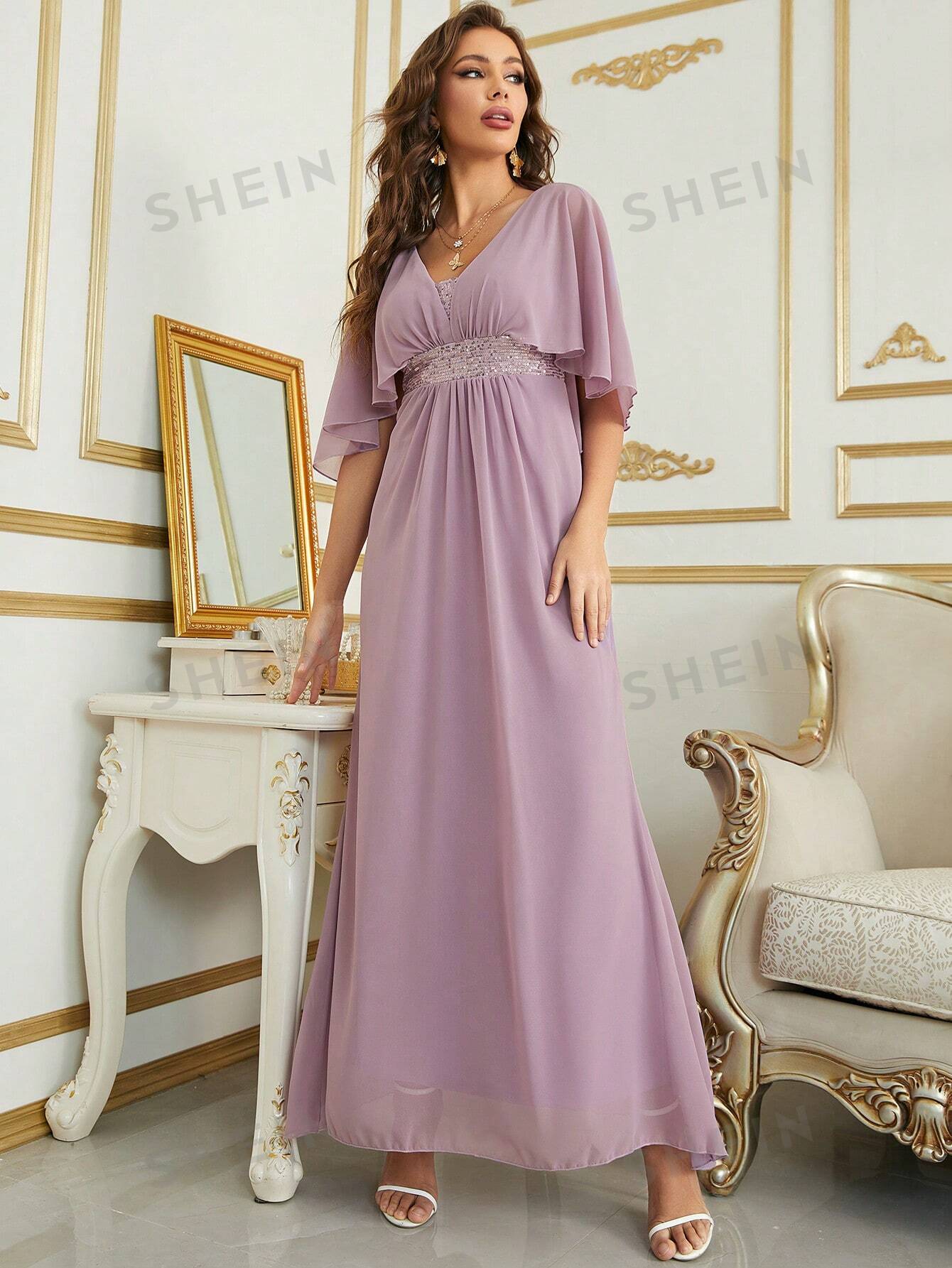 Contrast Sequin Cloak Sleeve Chiffon Bridesmaid Dress