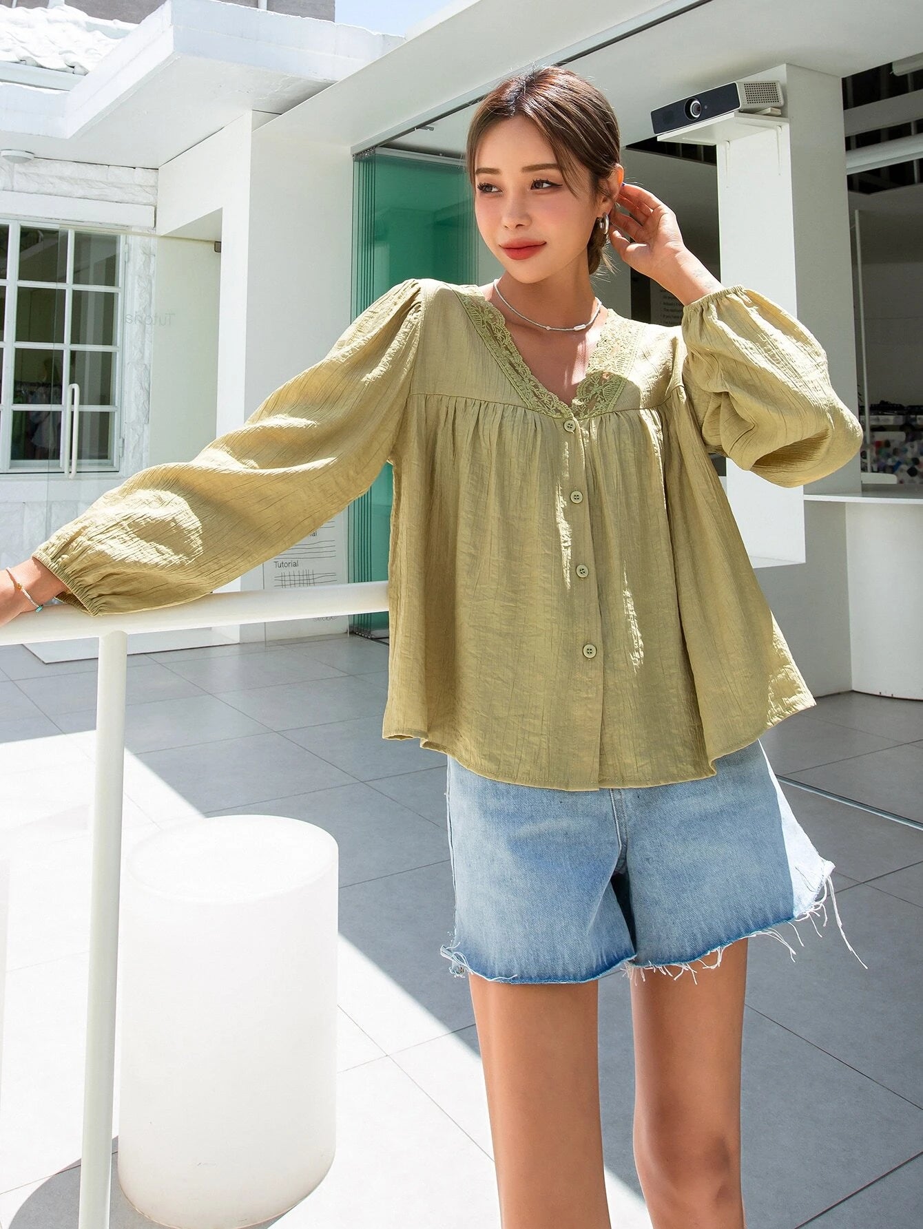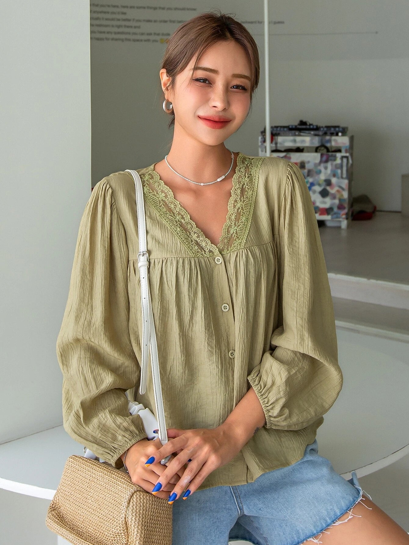 Color: Olive Green Style: Elegant Pattern Type: Plain Type: Top Neckline: V neck Details: Contrast Lace, Button...