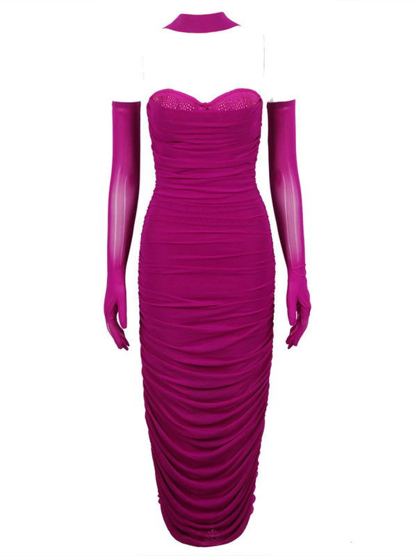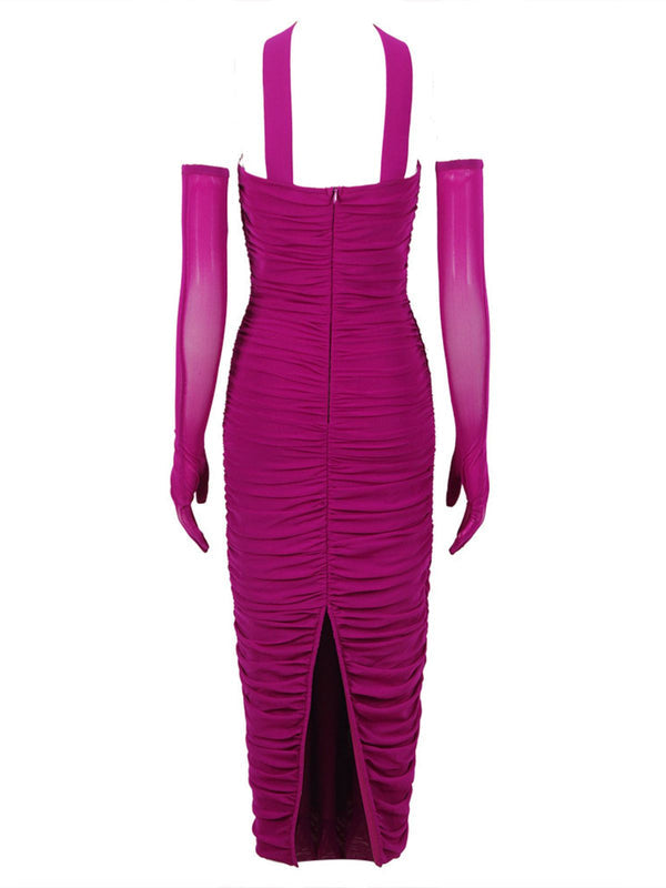 This Else Mesh Ruched Split Midi Dress with Gloves is a stunning and sophisticated choice for any formal event. Featuring a mesh ruched style with a split midi dress and gloves in a vibrant purple tone, it is sure to make you look and feel your best.