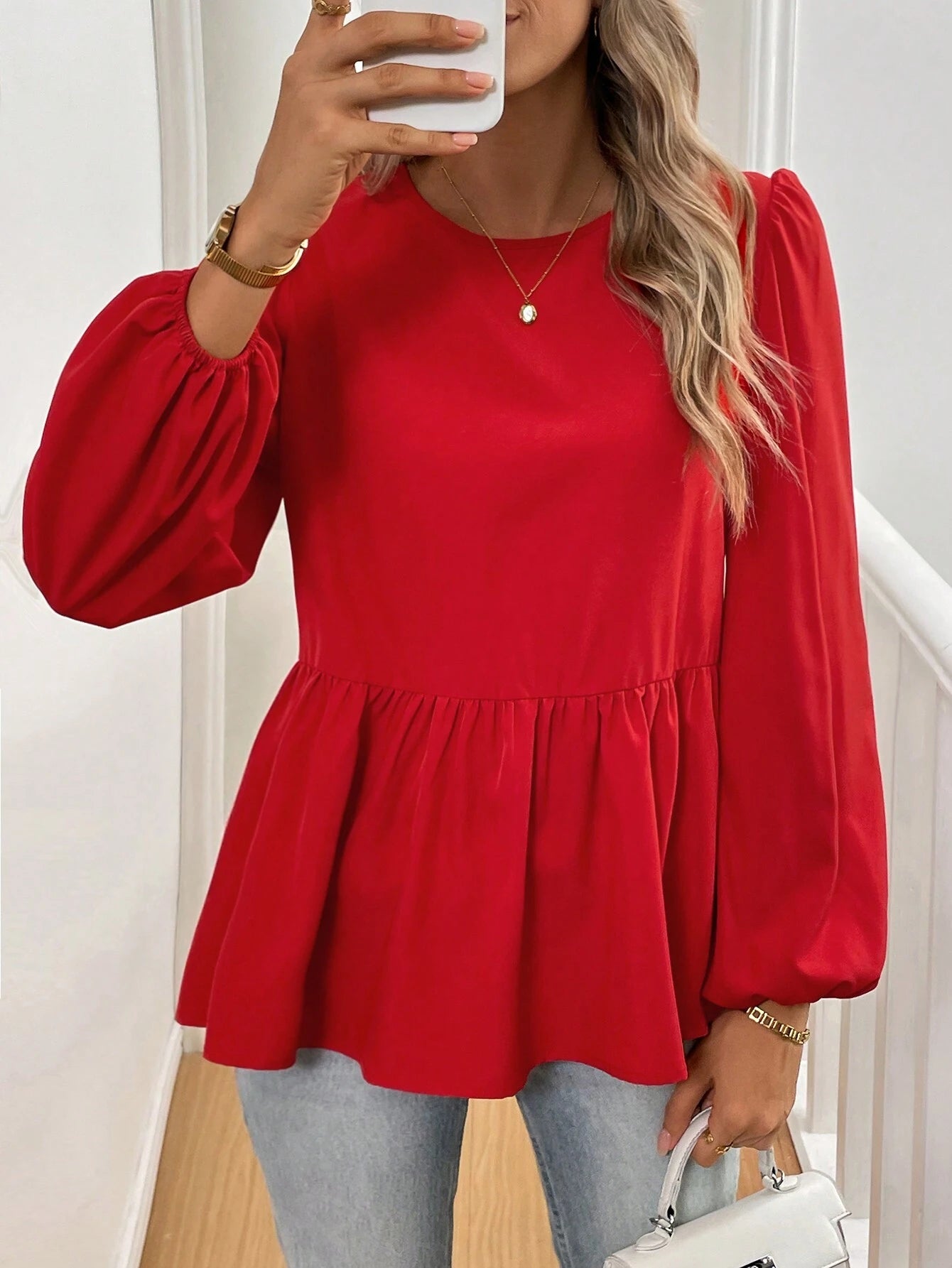 Details: Ruffle Hem, Tie Front Neckline: Round Neck Sleeve Type: Bishop Sleeve Style: Cute Type: Peplum Hem...