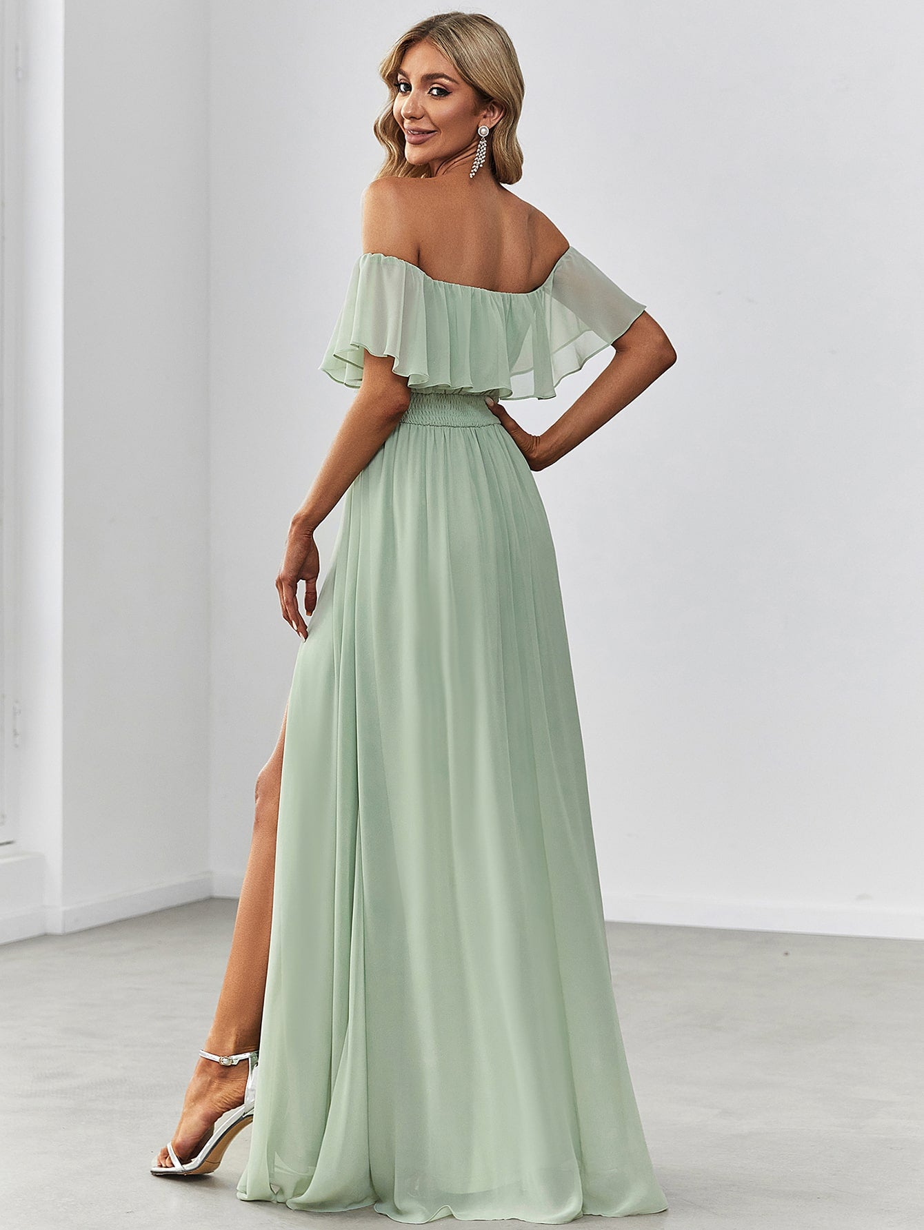 EVER-PRETTY Off Shoulder Ruffle Trim Split Thigh Chiffon Bridesmaid Dress