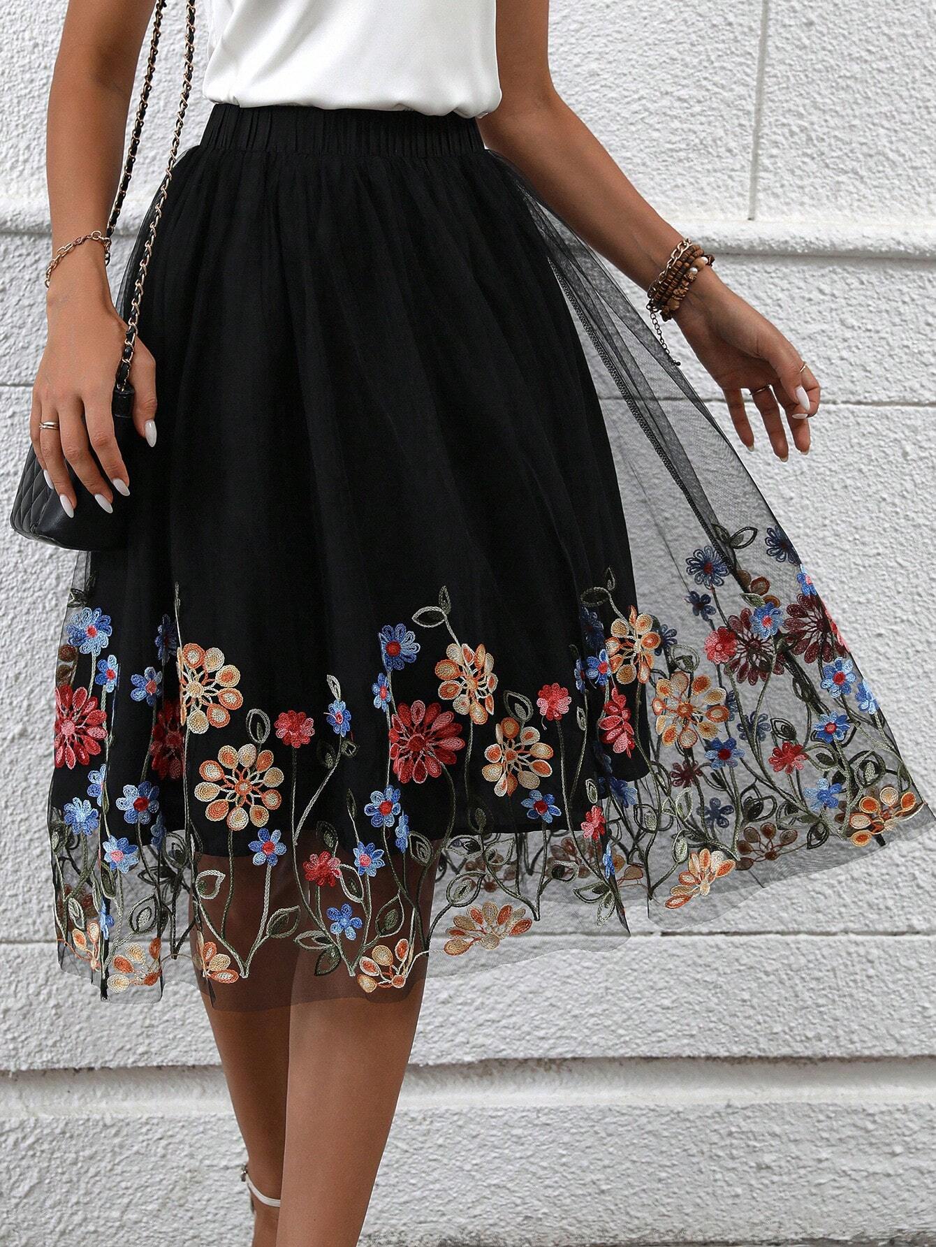 Floral Embroidery Mesh Overlay Skirt