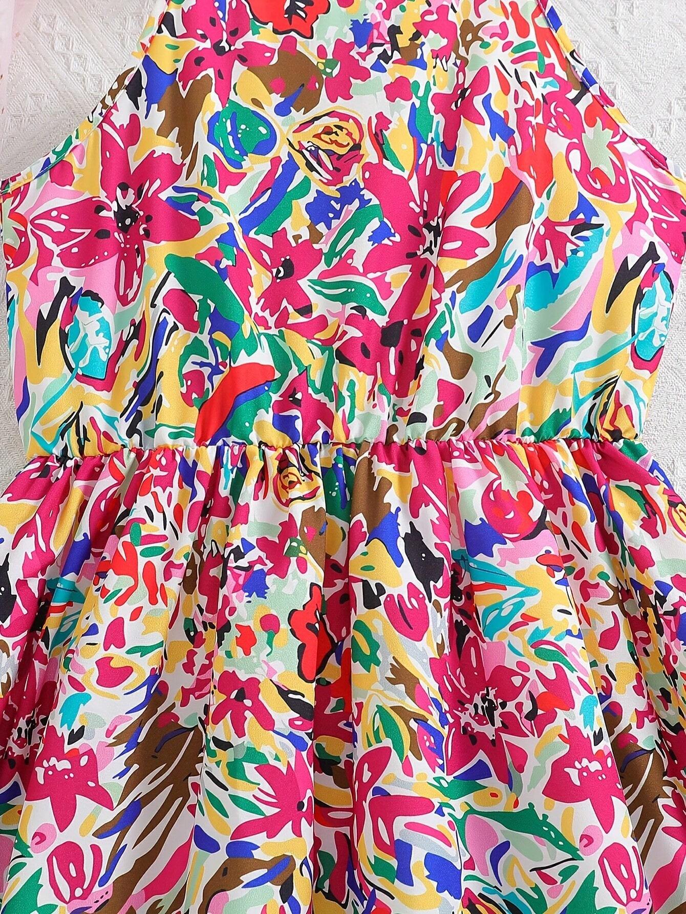 Girls' Fashionable Oil Painting Floral Printed Jumpsuit With Hat And Bag 3pcs/Set, Summer Outfits For Daily Wear