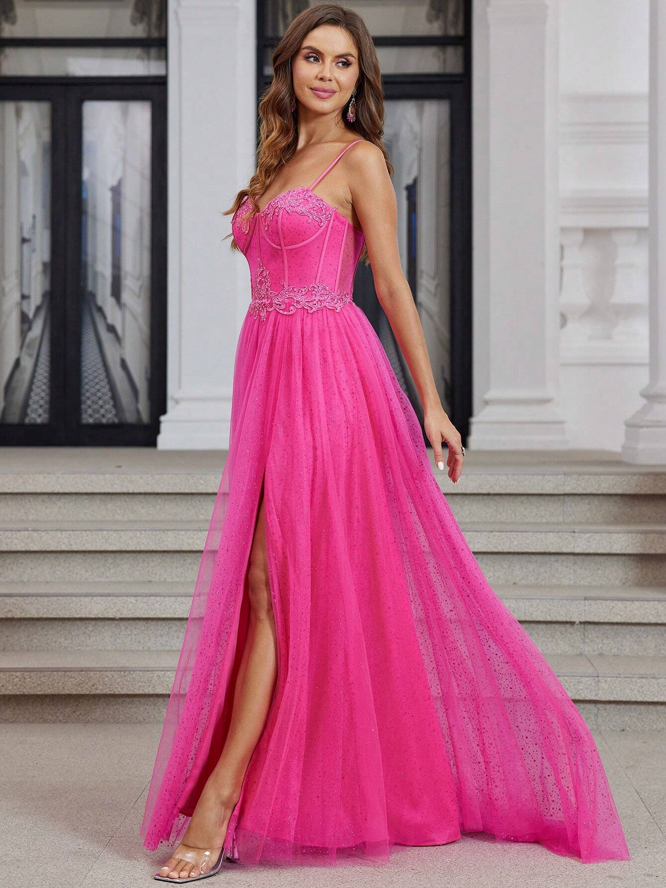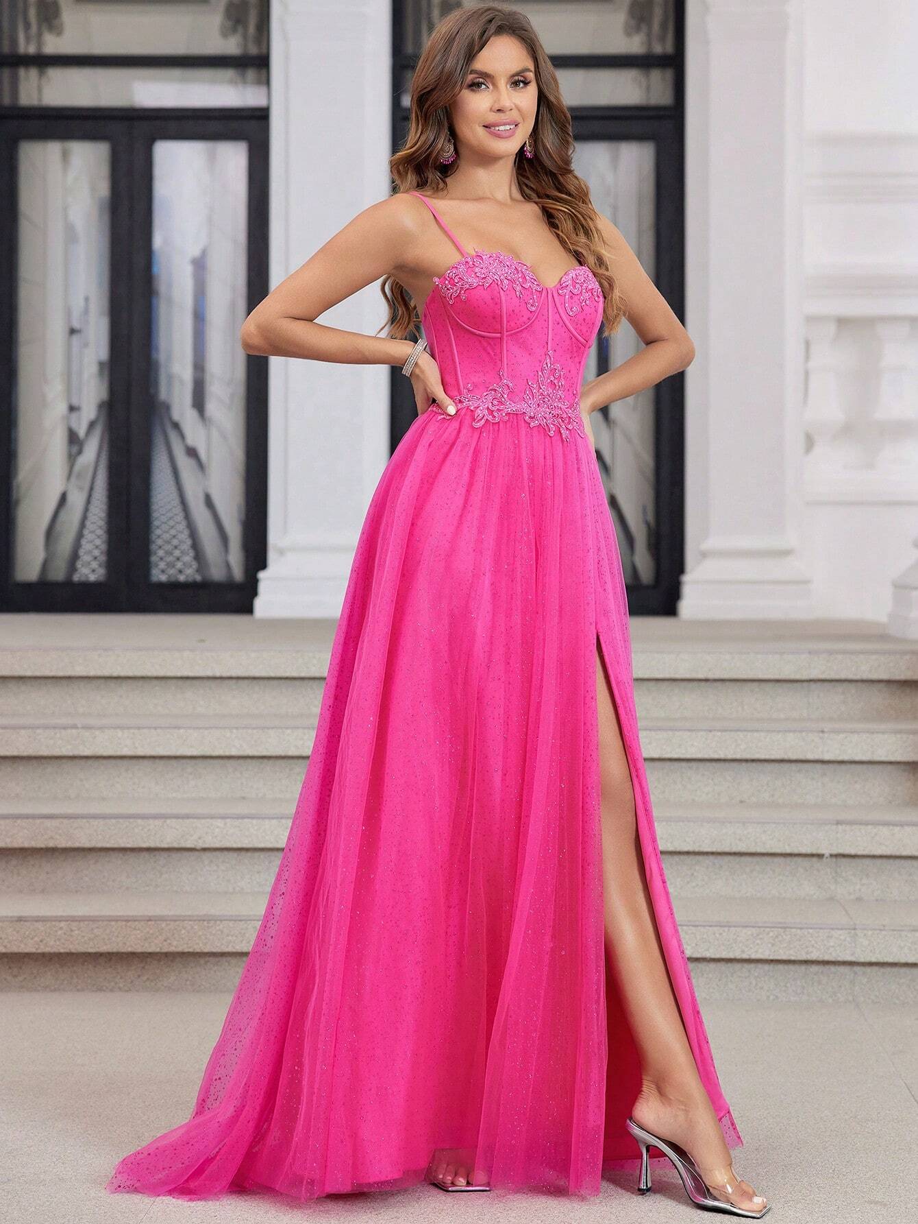 Hot Pink Sparkly Tulle Prom Dresses Long With High Slit Sweetheart Spaghetti Strap Formal Lace Evenving Gown For Teens