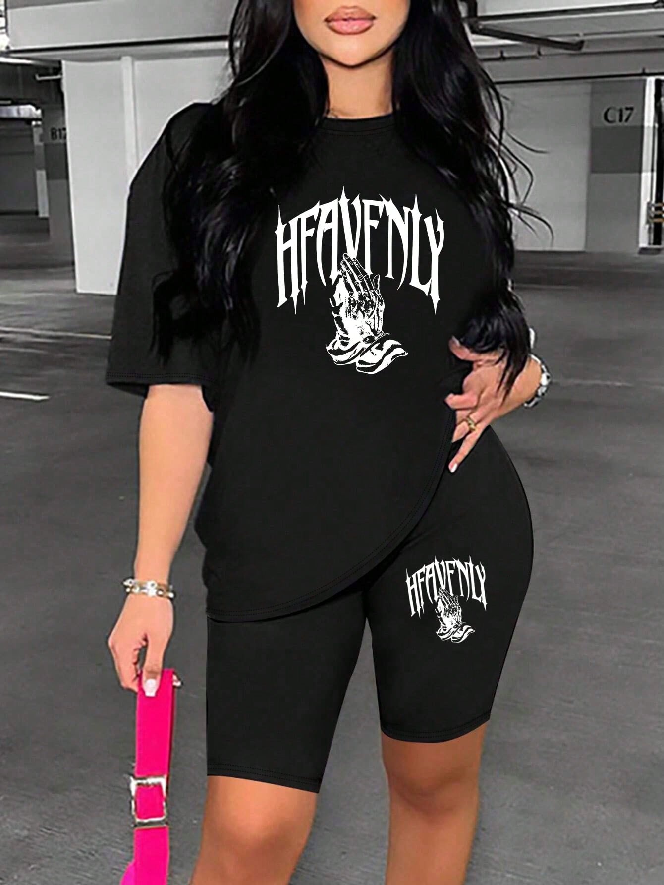 Letters & Hand Printed Women's Casual Overside Short Sleeve Leggings Set Summer
