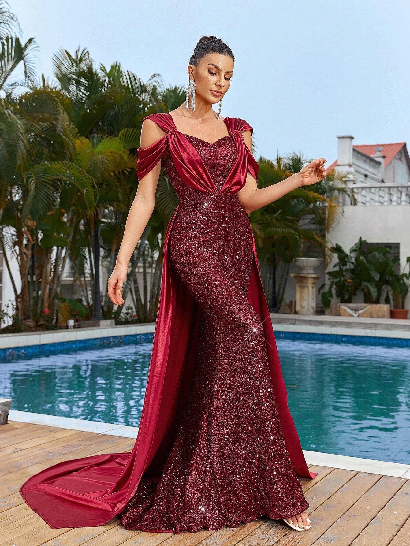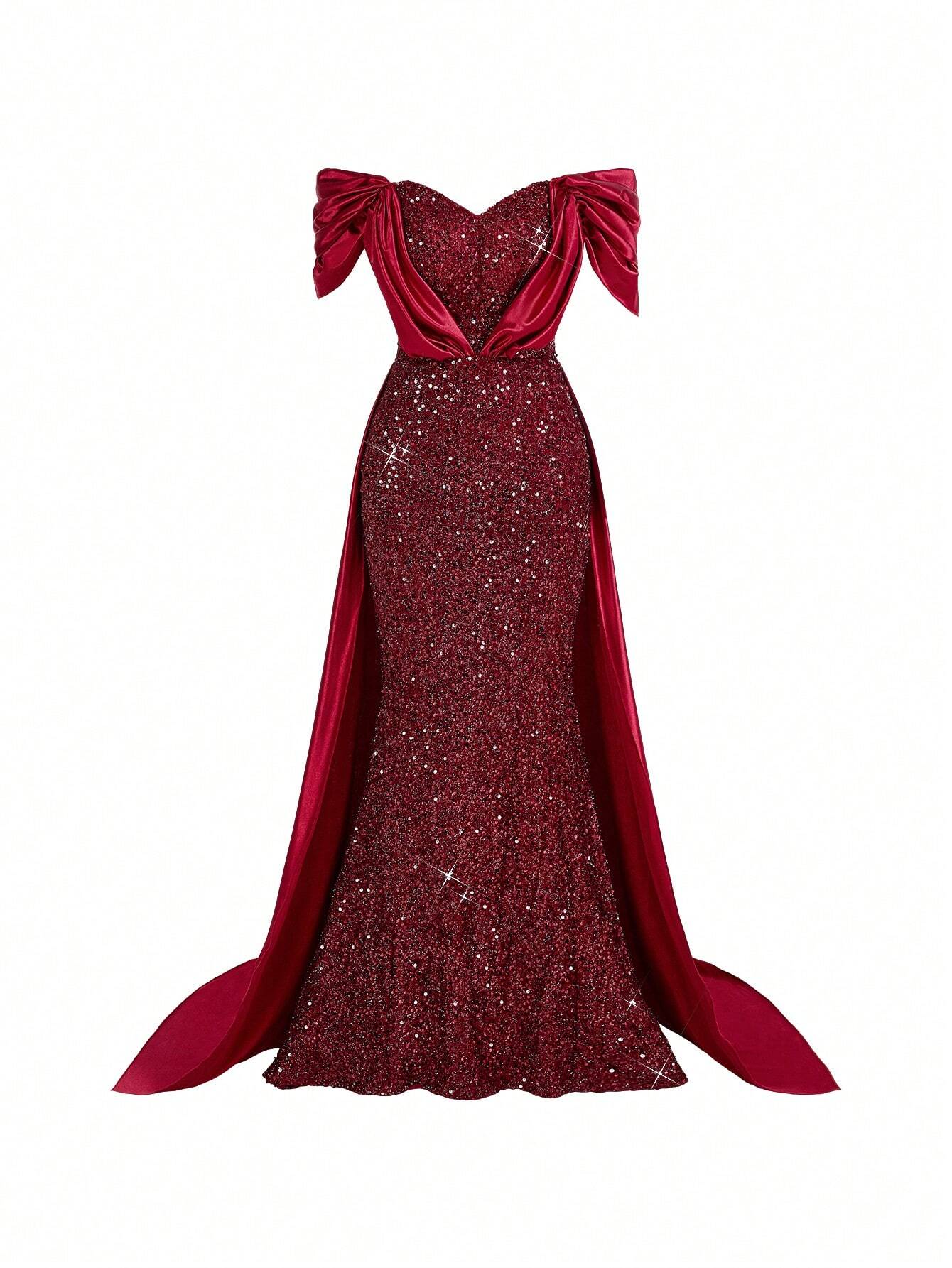 Noble Gorgeous Sexy One Shoulder Sleeve Sequin Satin Fabric Patchwork Ruffle Mermaid Evening Dress With Train