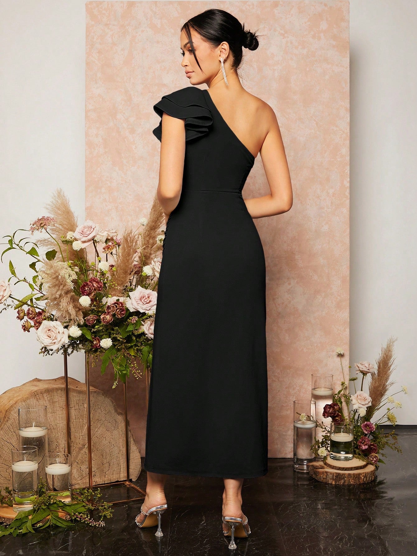 Pattern Type: Plain Details: Ruffle, Wrap Sleeve Length: Sleeveless Length: Long Type: Sheath Color: Black Neckline: Asymmetrical...