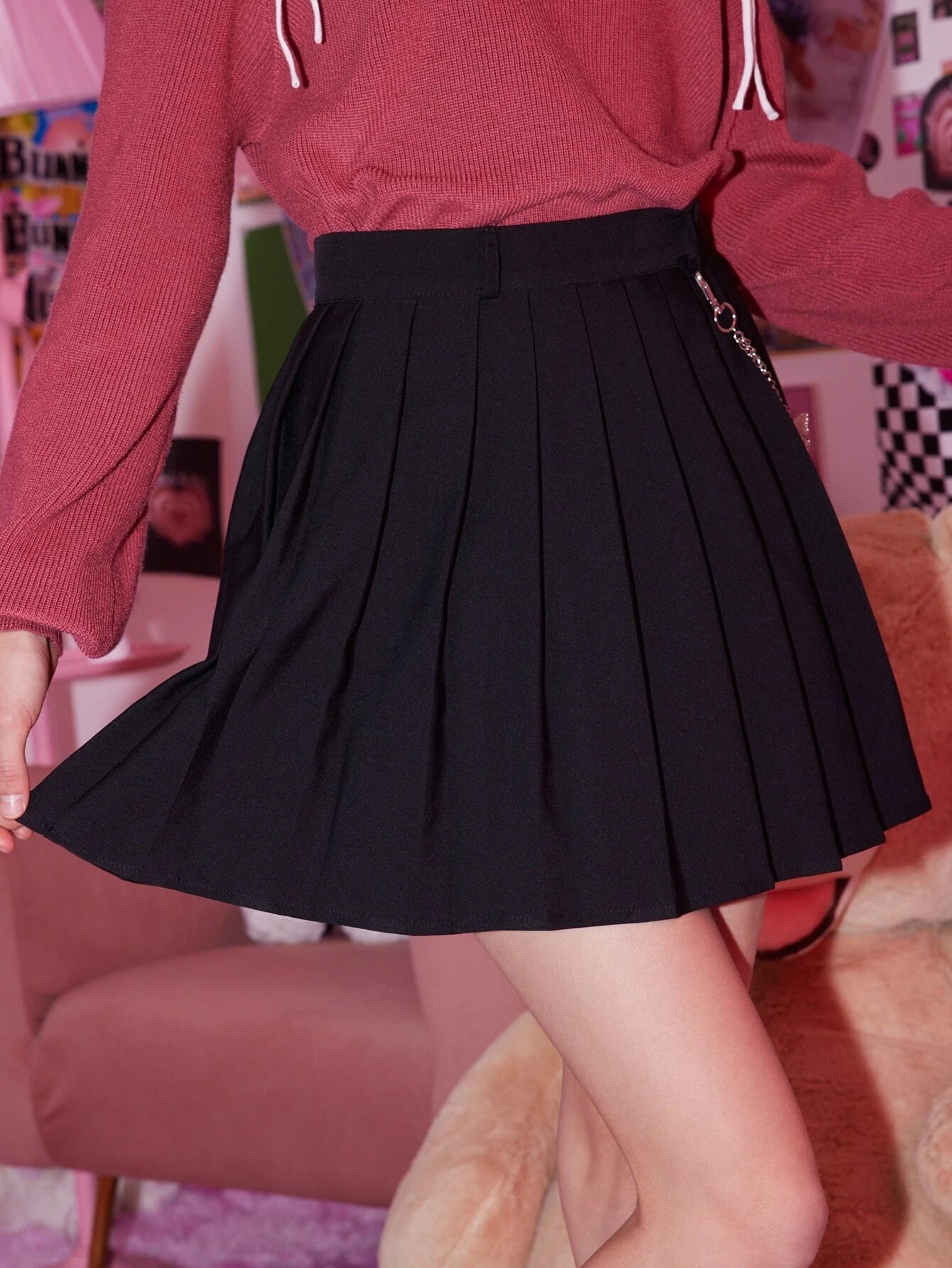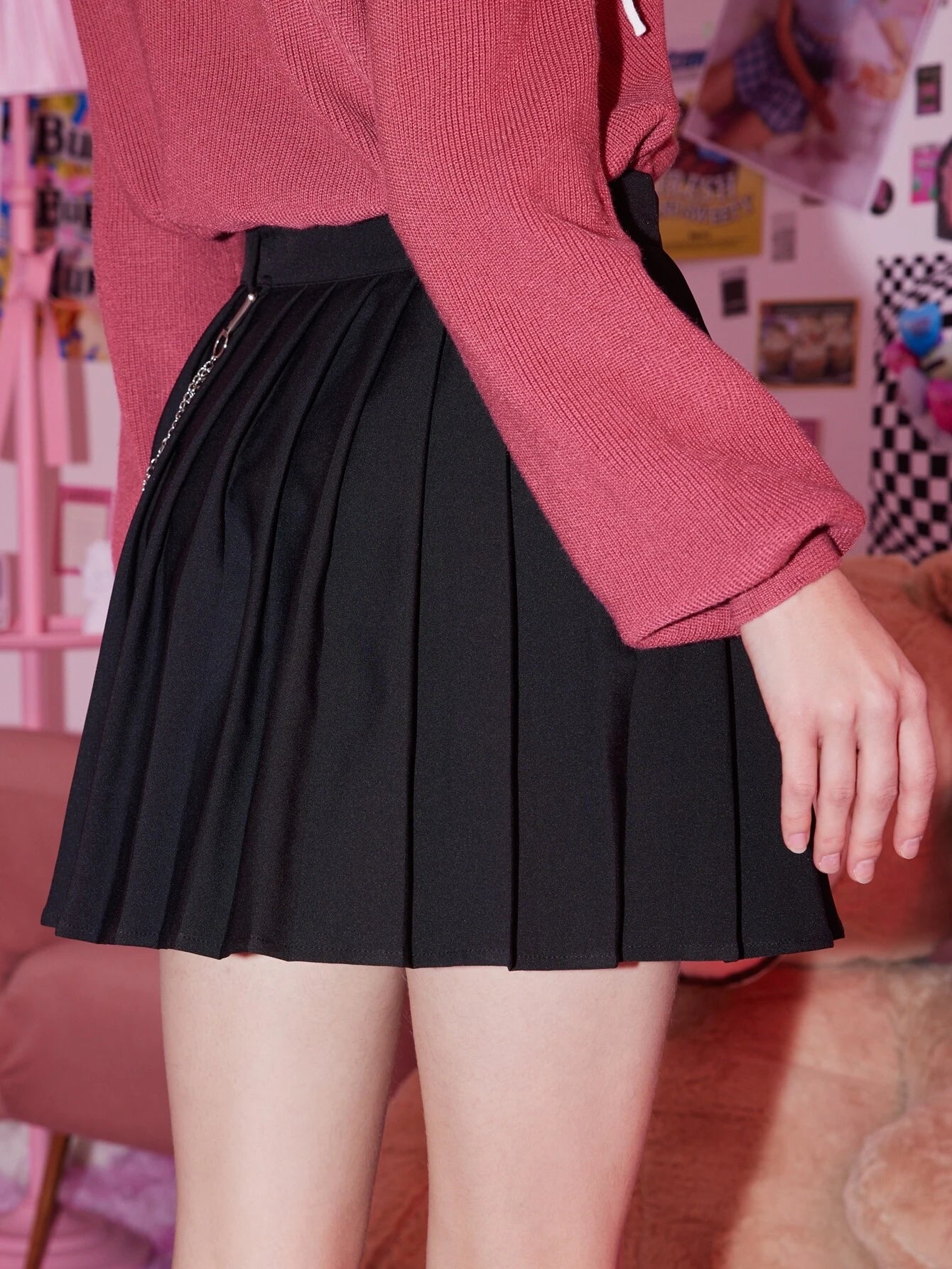 Details: Pleated, Chain Style: Casual Type: Pleated Features: Long-Lasting Color: Black Pattern Type: Plain Waist Line: High...