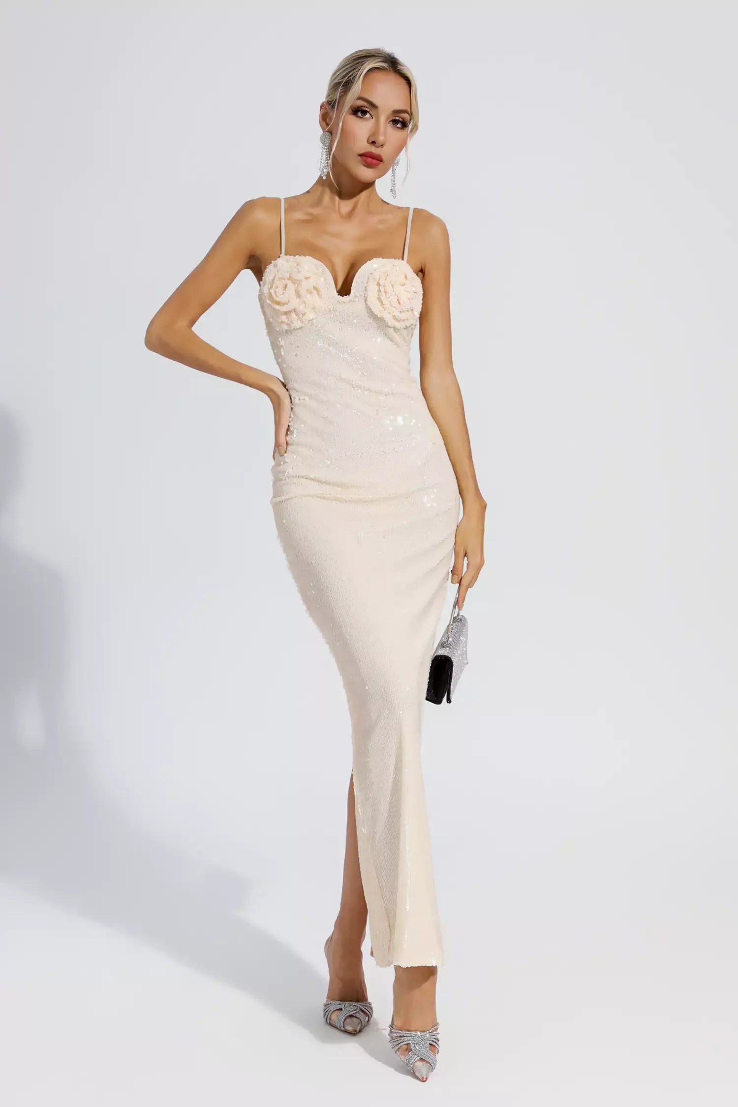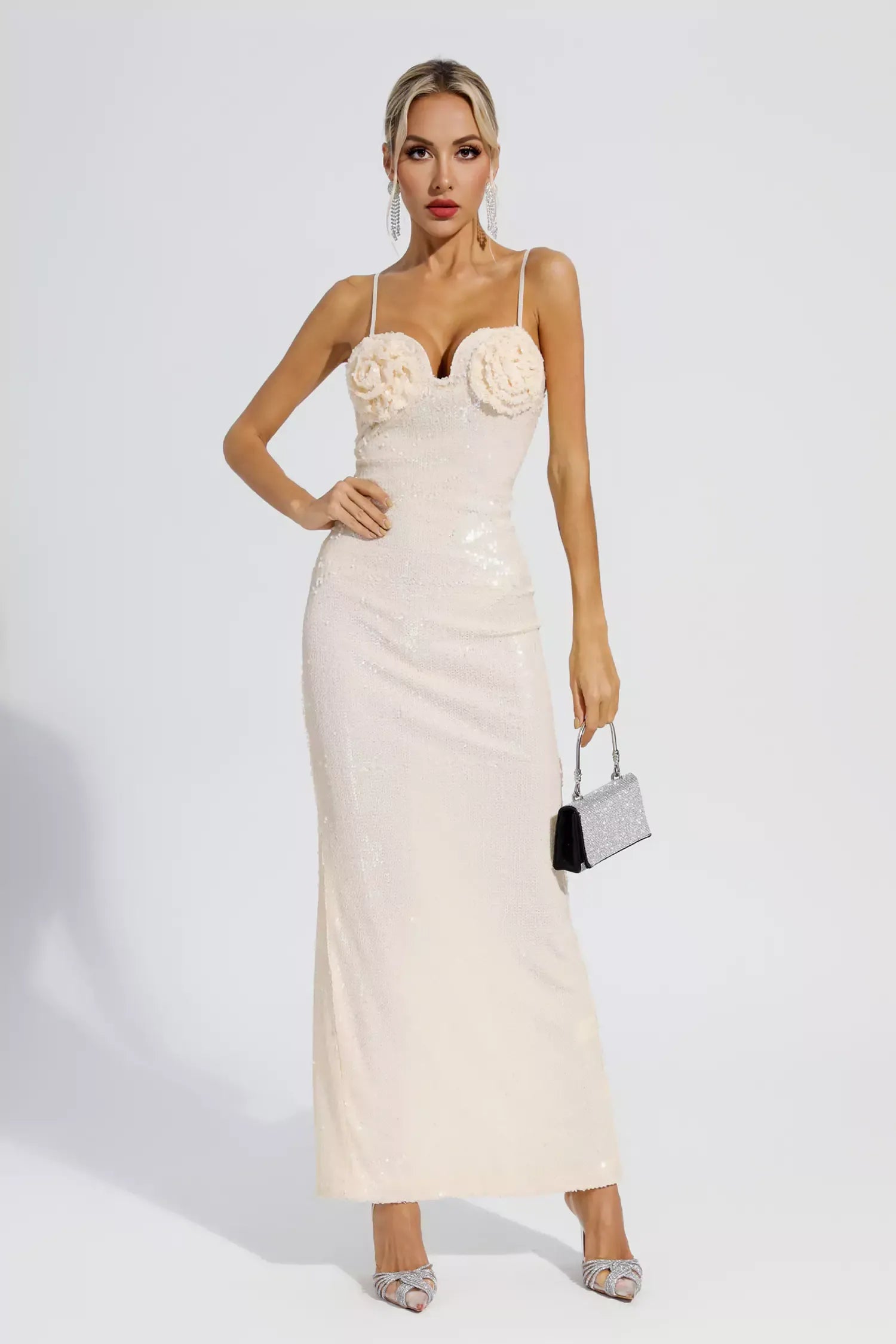 For banquets, you'll need our Rowan Champagne Gold Sequin Dress. Slender suspenders connect the dress. Sequined flowers...