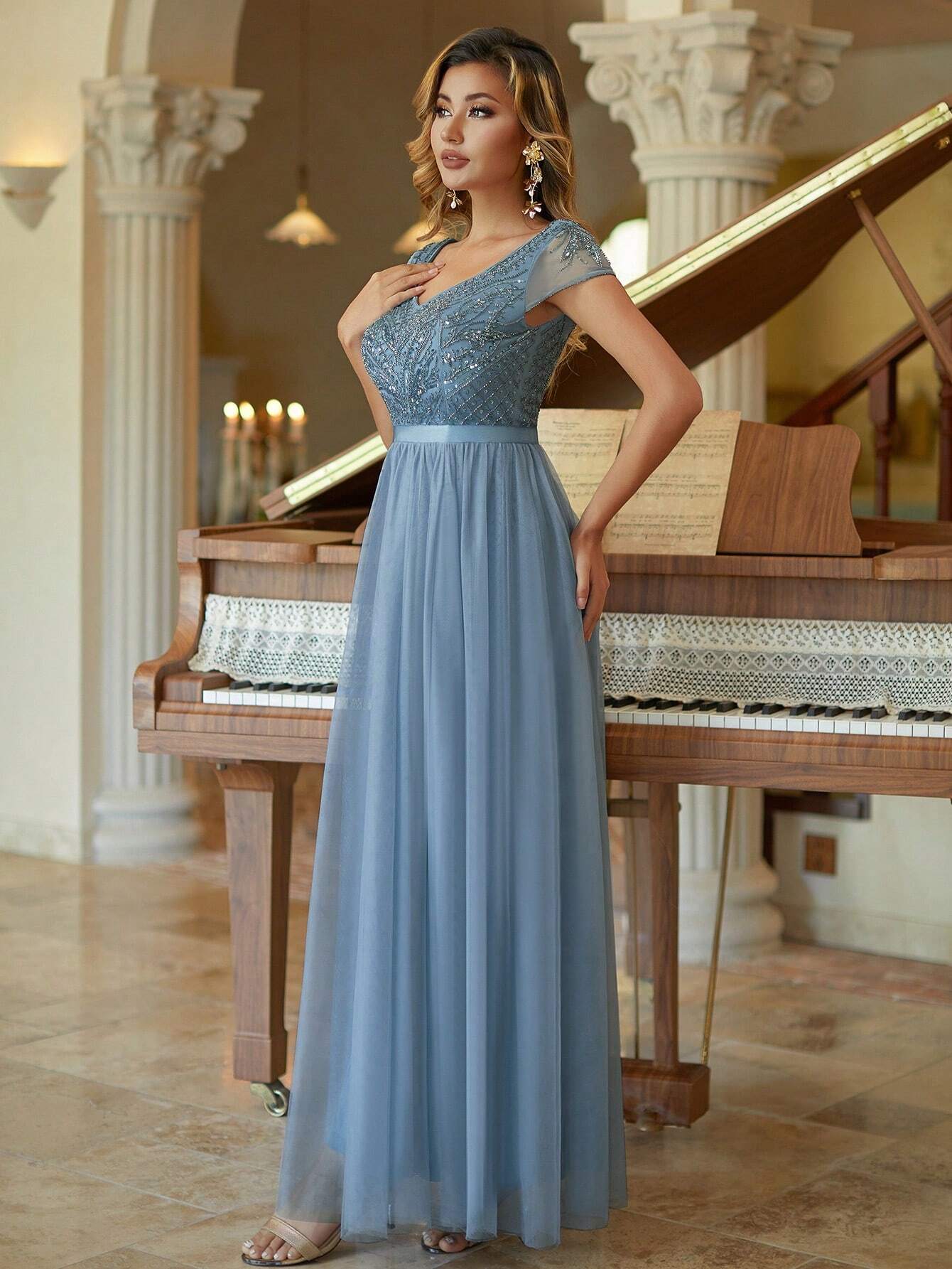 Short Sleeves Tulle Column Evening Dress Beaded Bridesmaid Dress
