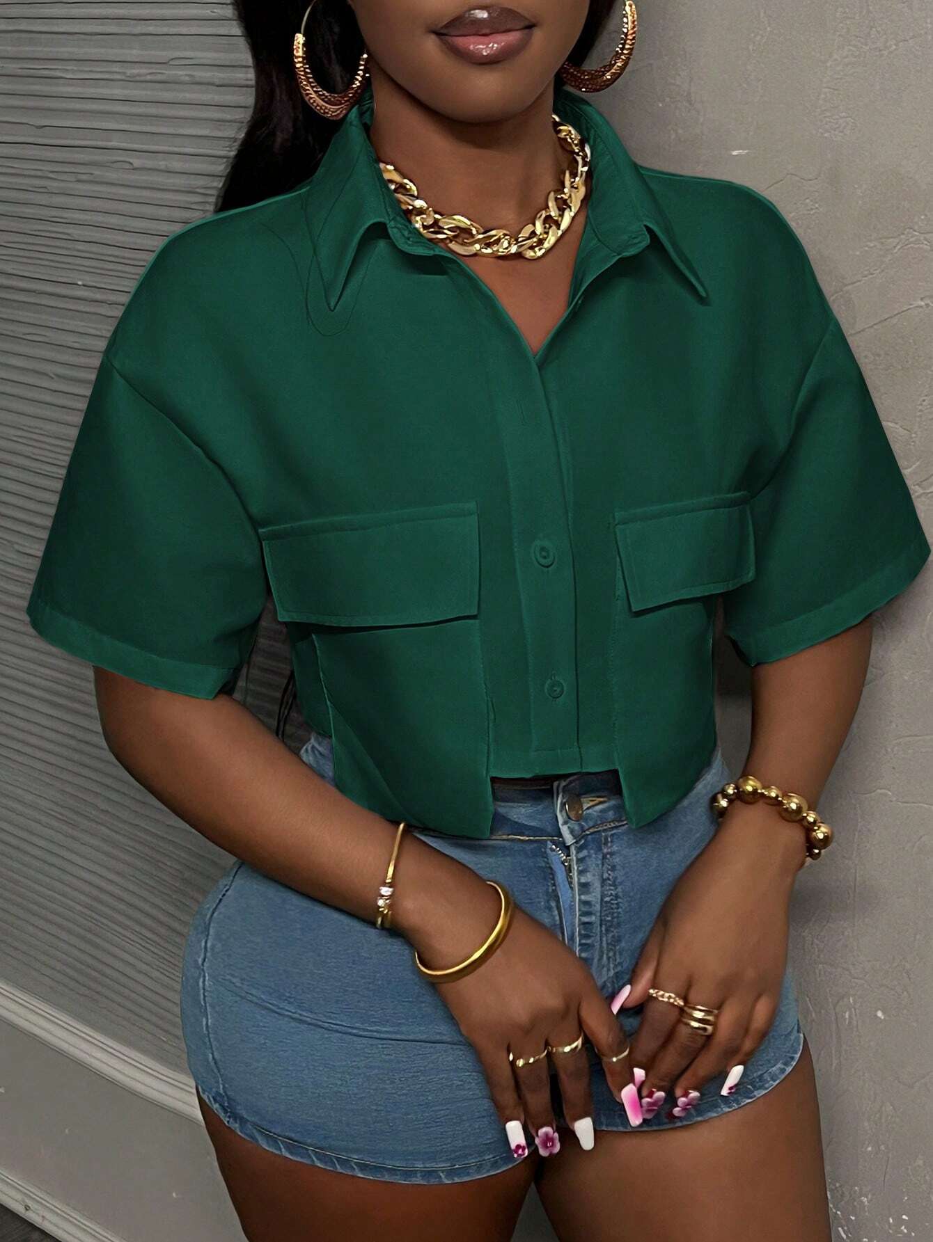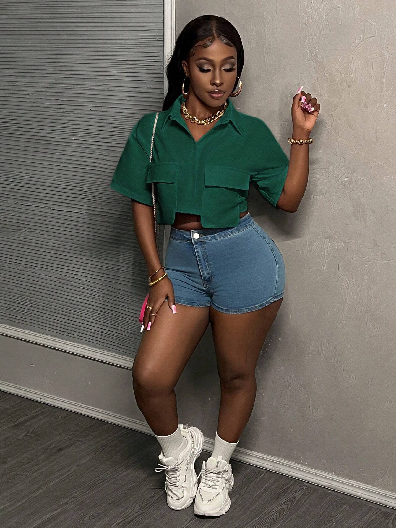 Slayr Casual Street Style White Polo Collar Pocket Hem Cropped Work Top Tee, Women Short Sleeve Shirt