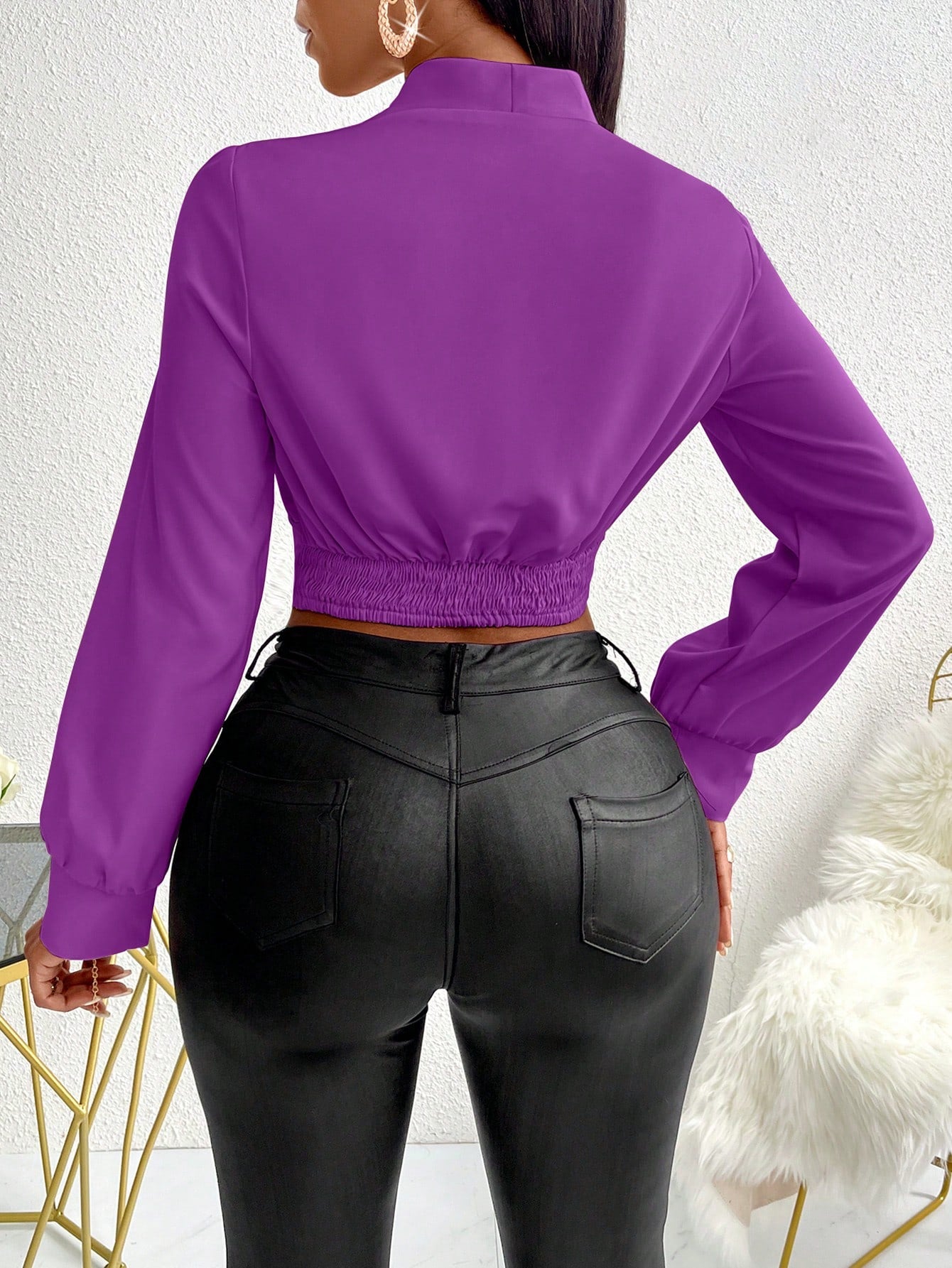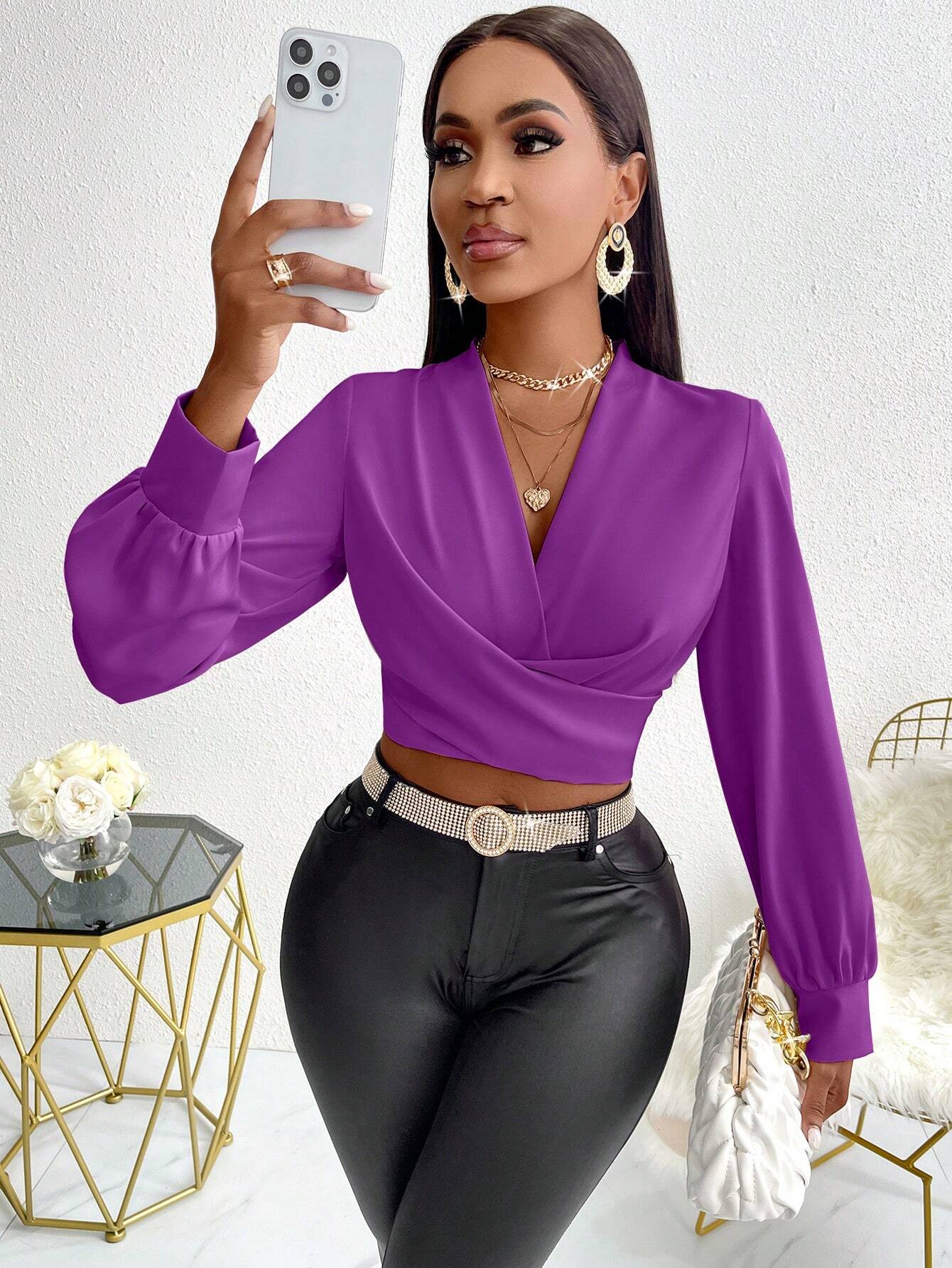 Color: Purple Hem Shaped: Tight Hem Style: Elegant Sleeve Type: Bishop Sleeve Details: Draped, Wrap Neckline: V...
