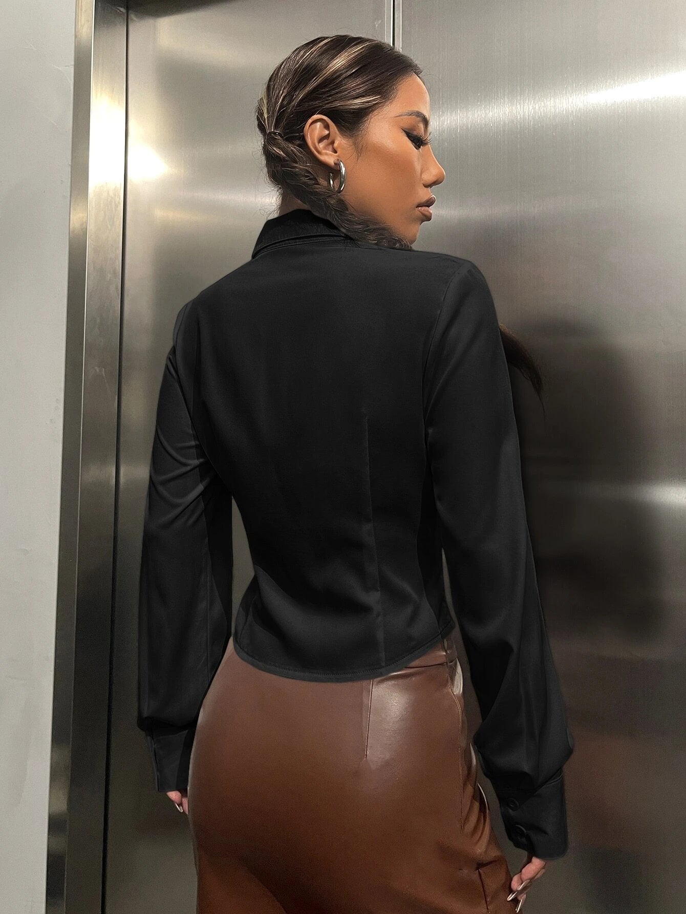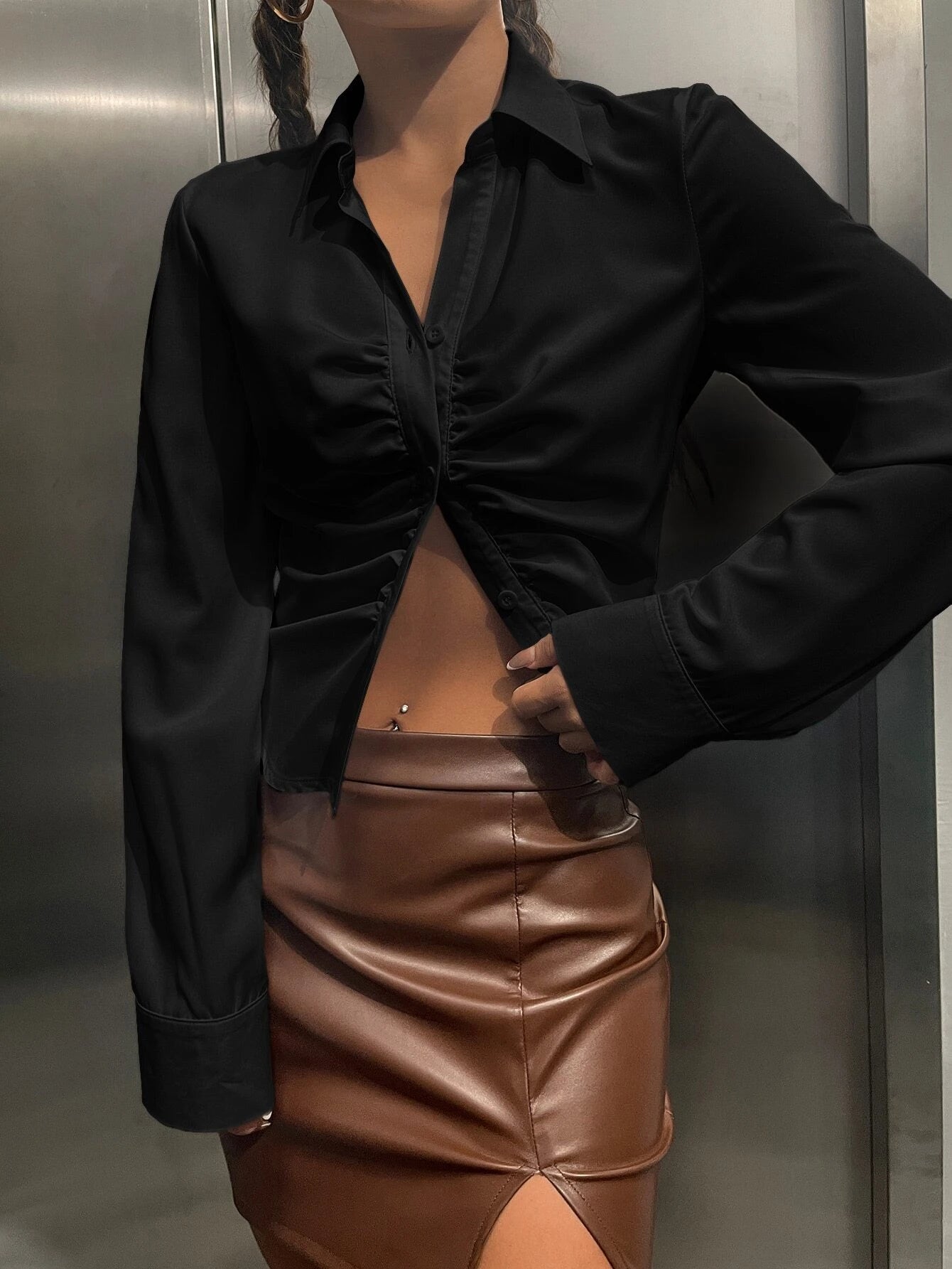 Color: Black Style: Casual Pattern Type: Plain Type: Shirt Neckline: Collar Details: Ruched, Button Front Sleeve Length:...