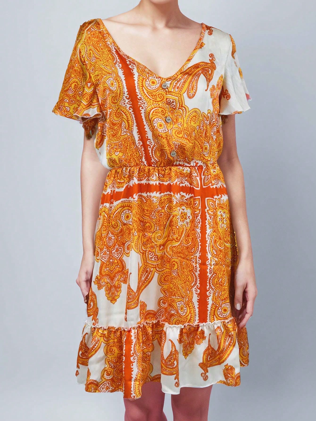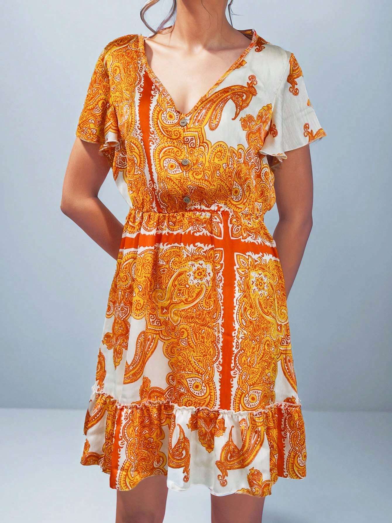 Details: Ruffle Hem, Knot Neckline: V neck Sleeve Type: Flounce Sleeve Style: Cute Type: A Line Waist...
