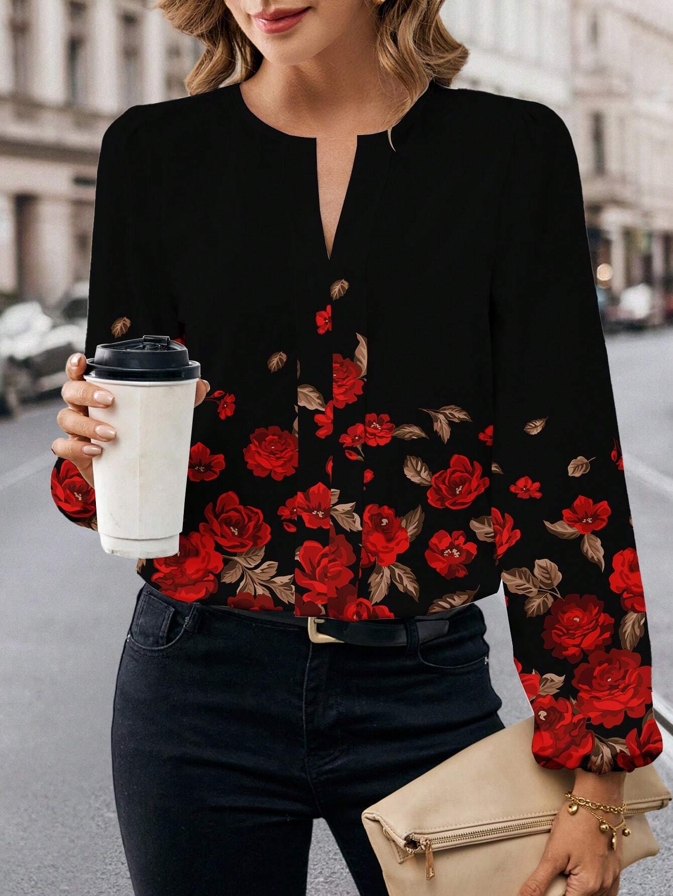 Neckline: Notched Sleeve Type: Bishop Sleeve Style: Casual Type: Top Hem Shaped: Regular Color: Black Pattern Type:...