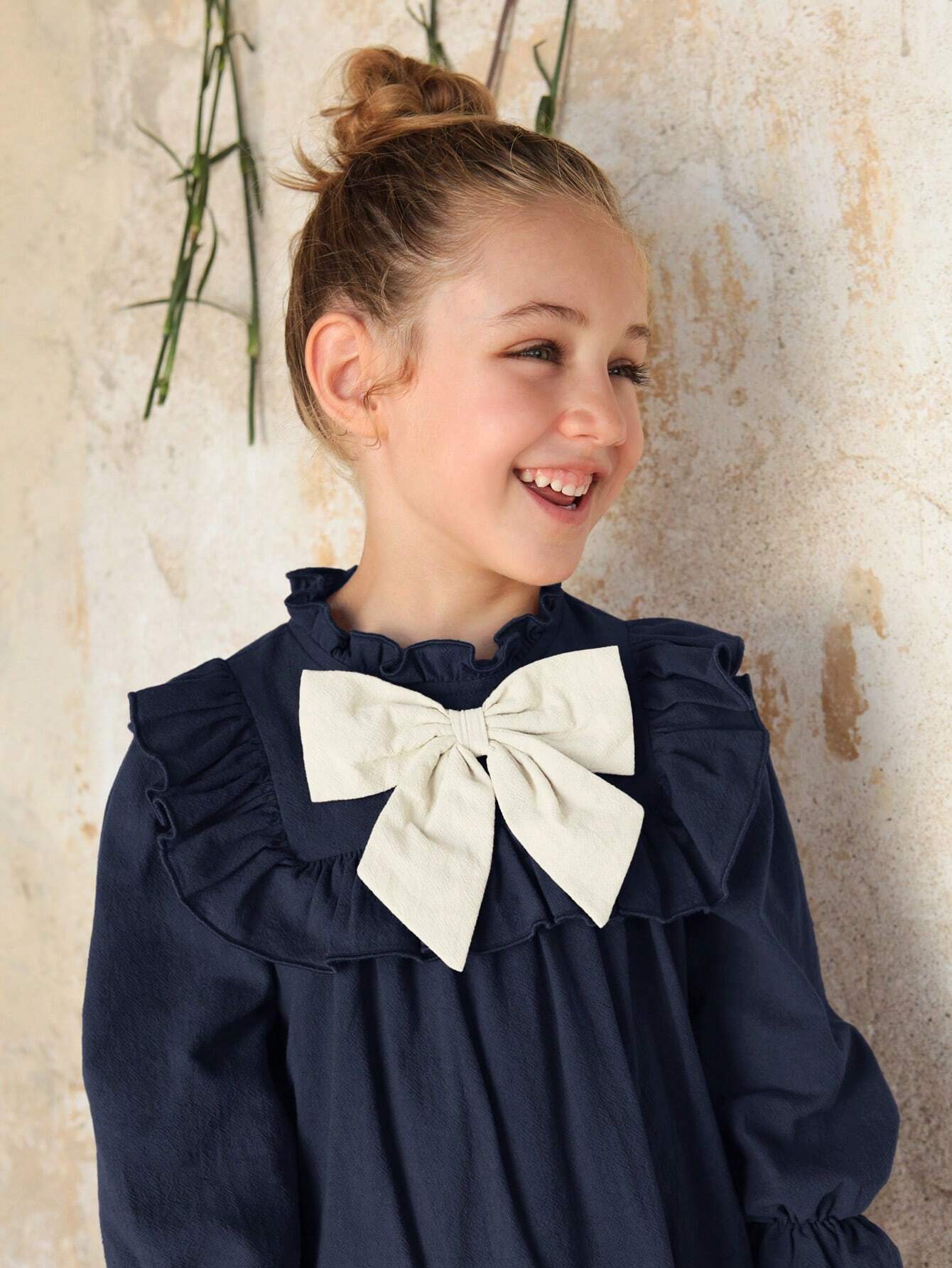 Young Girl Colorblock Bow Decor Long Sleeve Ruffle Hem Loose Fit Dress