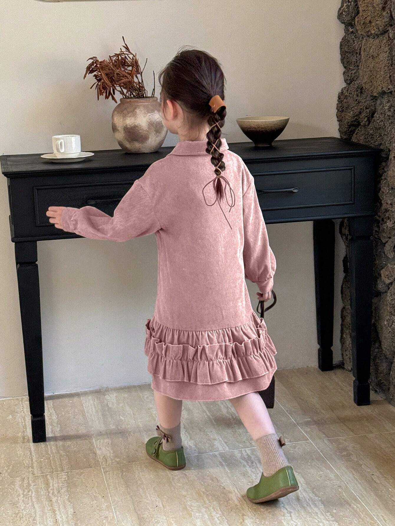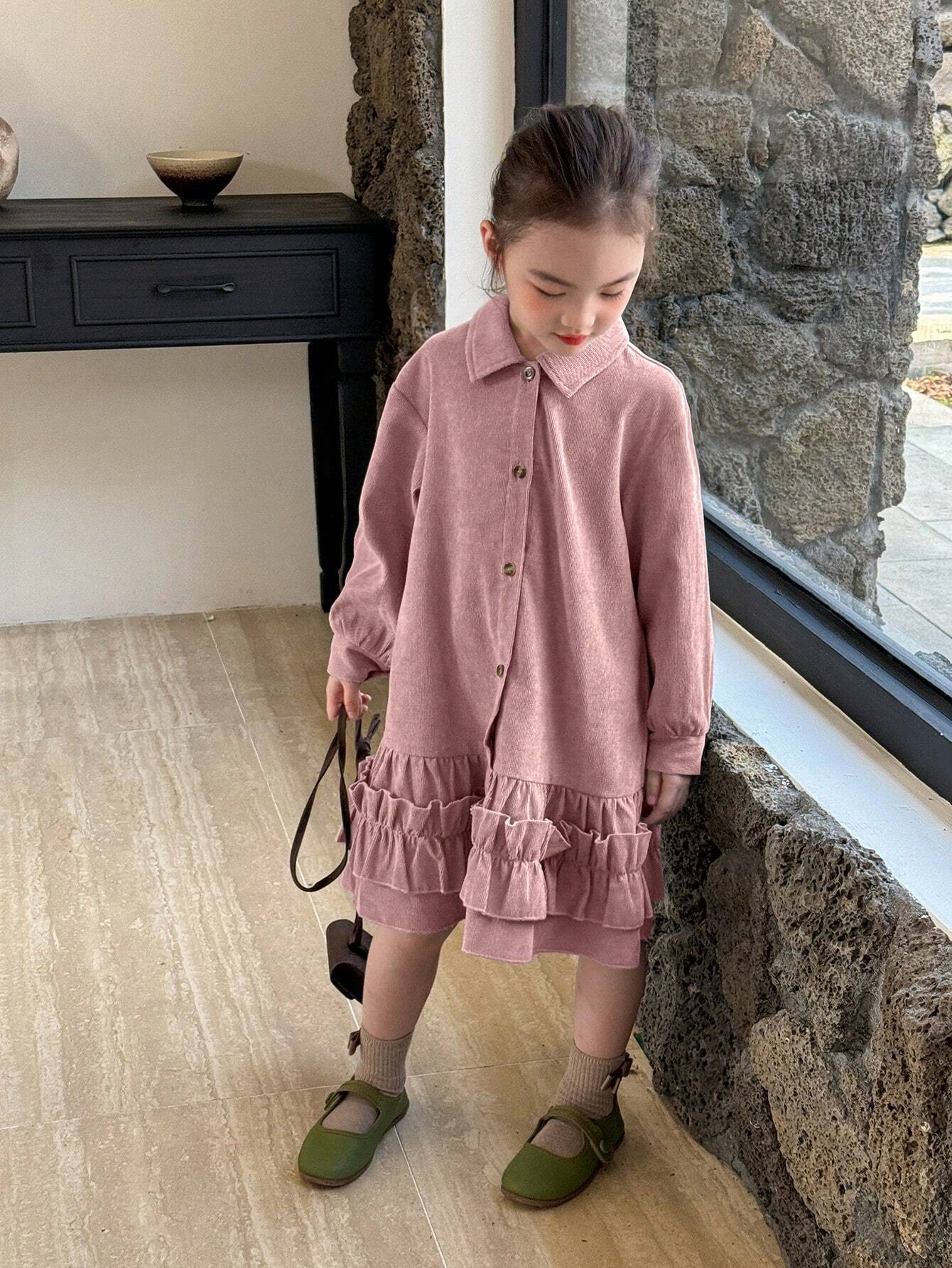Young Girl Elegant Casual Lady Shirt With Ruffled Hem Design, Long Sleeve Corduroy Dusty Pink Blouse, Suitable For Commuting, Autumn/Winter