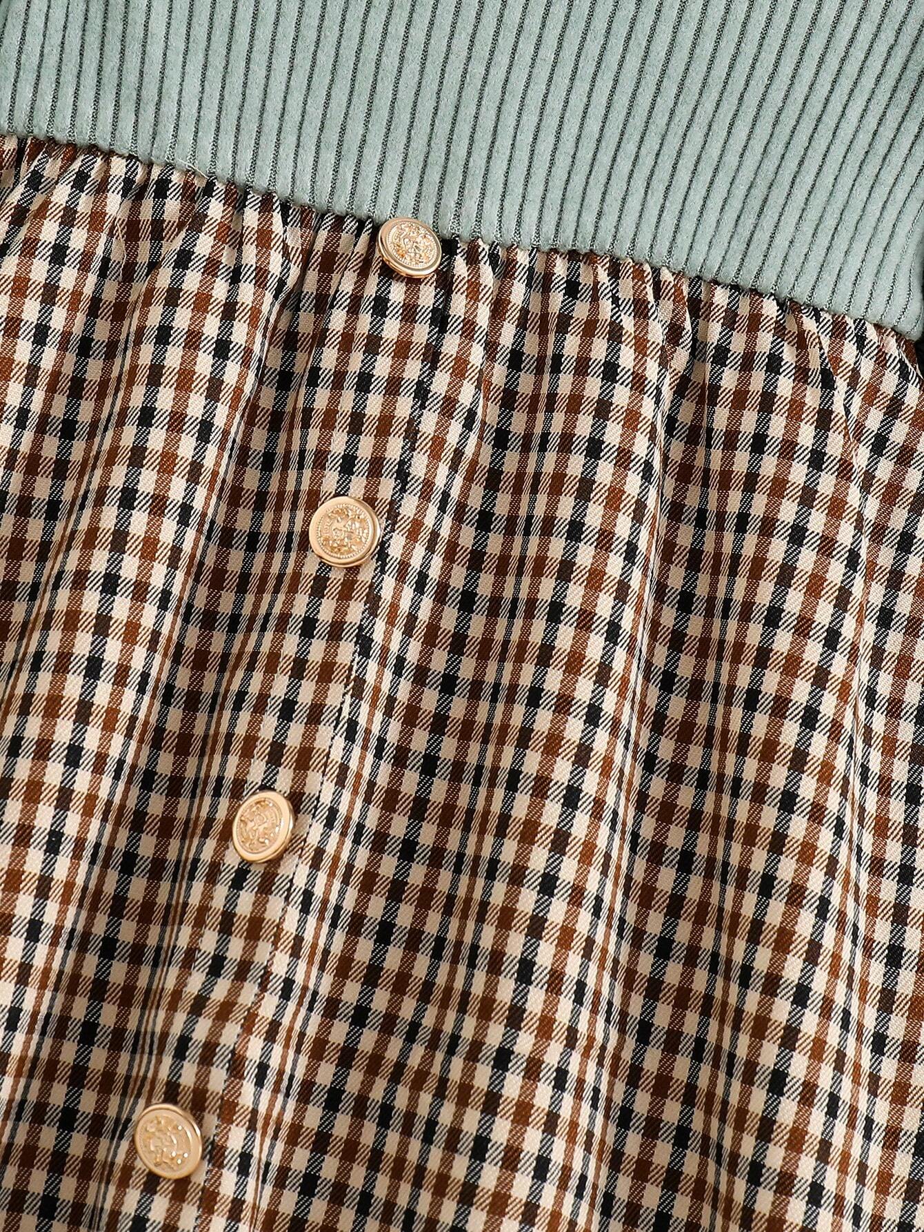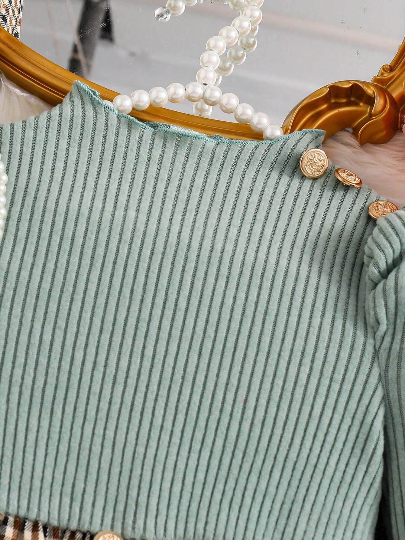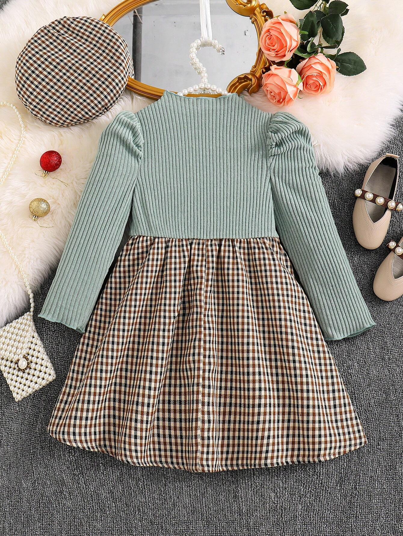 Young Girl Ribbed Long Sleeve Knit Top With Plaid Woven Hem Dress + Hat, Elegant Casual For Autumn/Winter