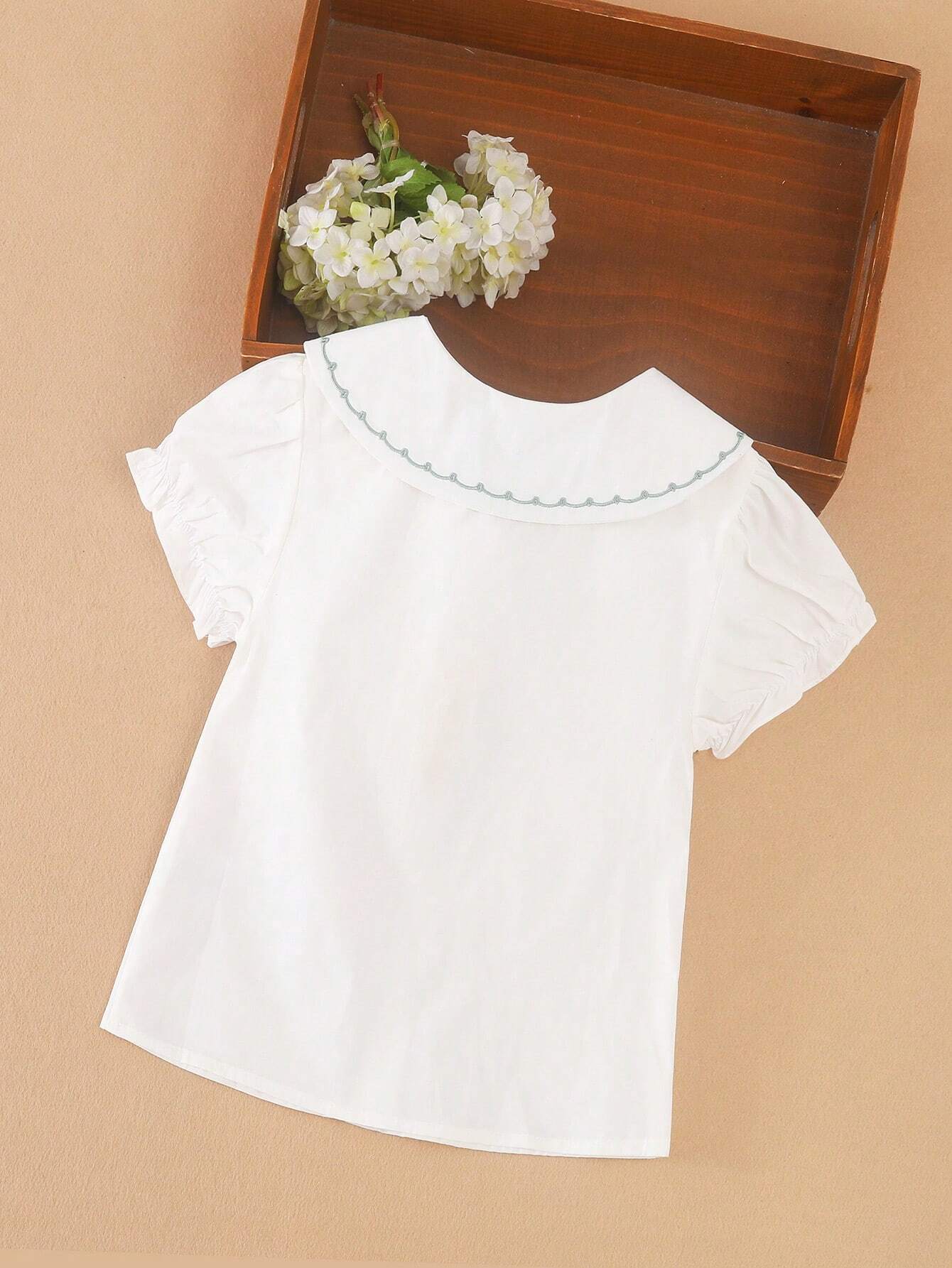 Young Girl's Embroidered Short-Sleeved Shirt With Turn-Down Collar, Summer