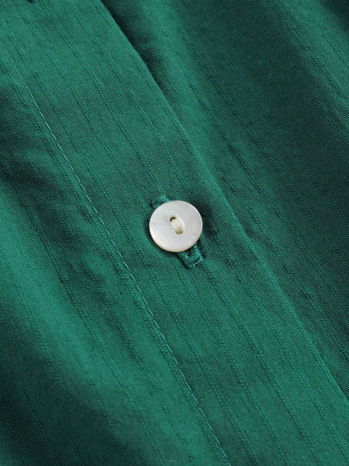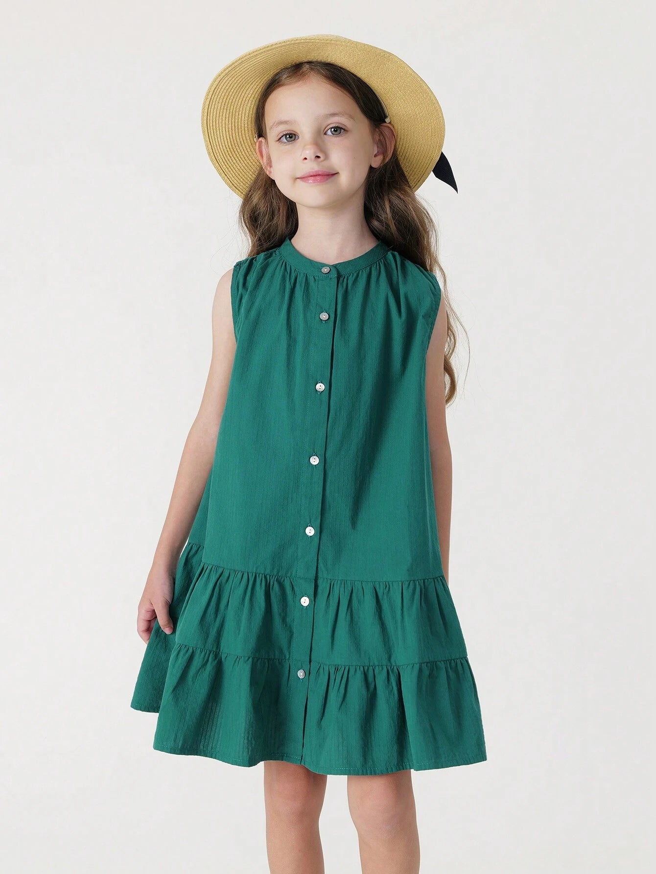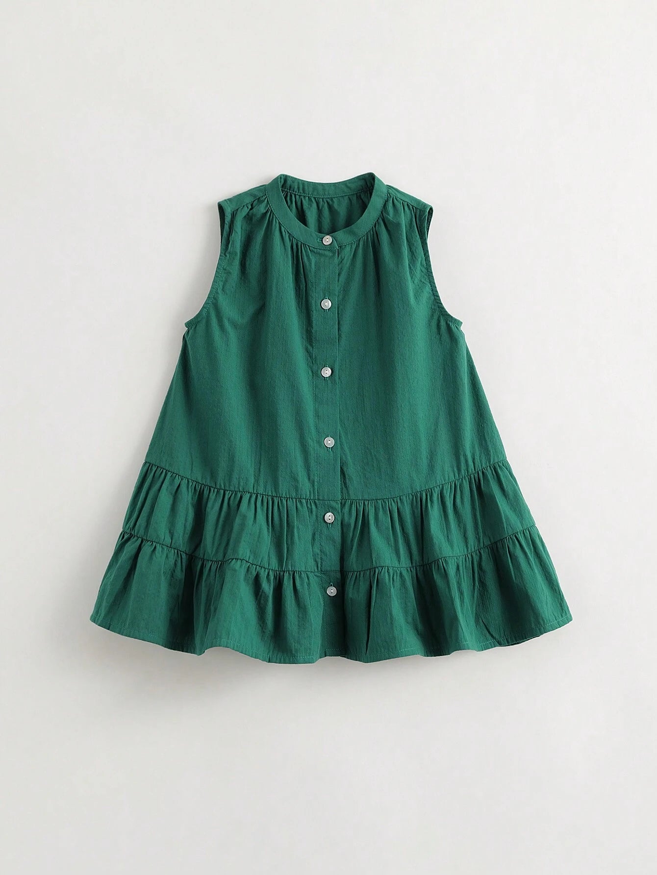 Color: Green Style: Cute Pattern Type: Plain Neckline: Round Neck Sleeve Length: Sleeveless Details: Ruffle Hem, Button...