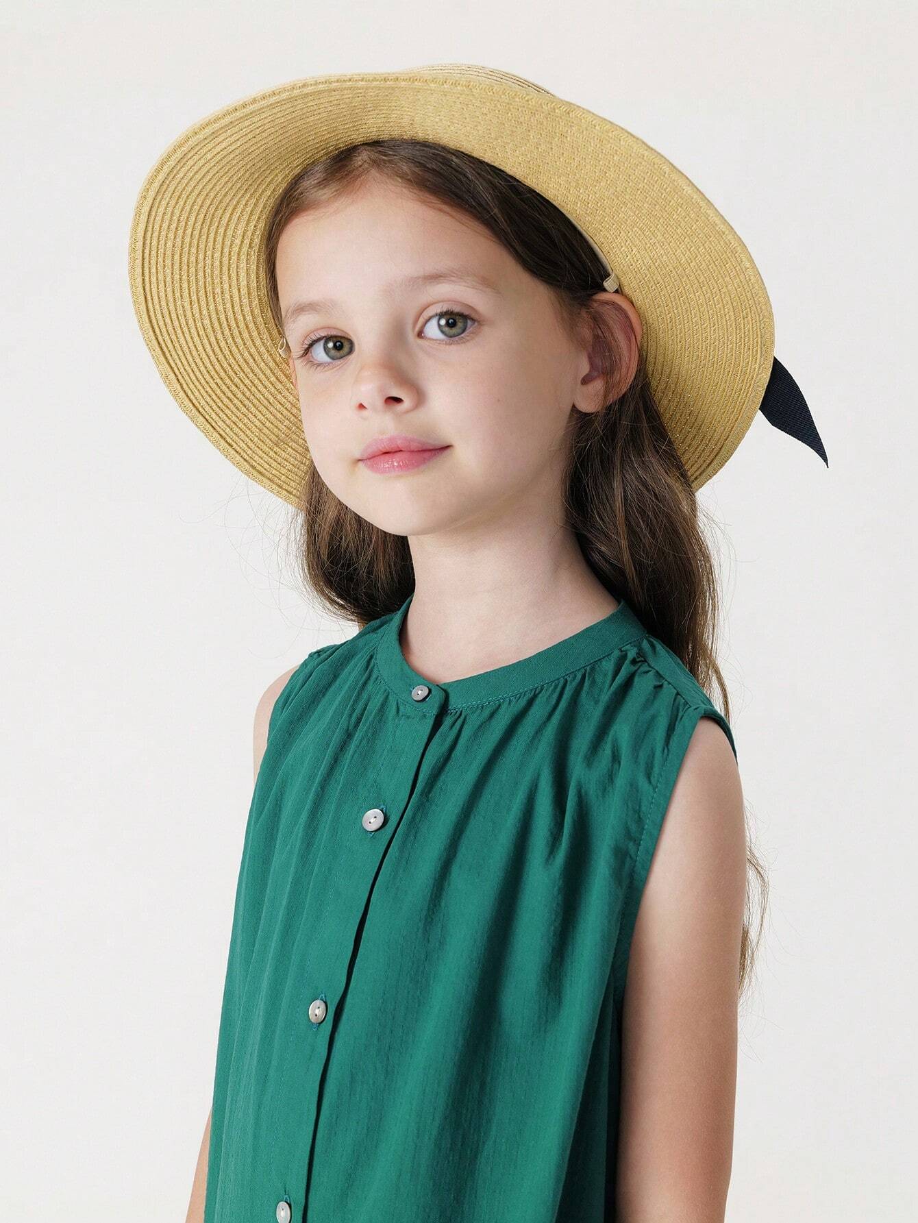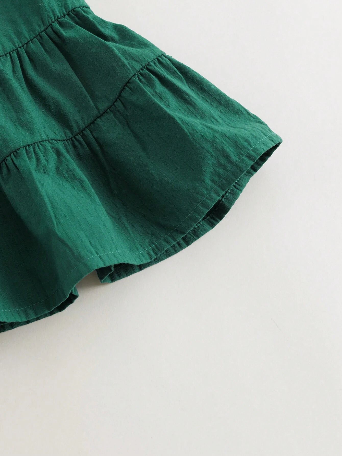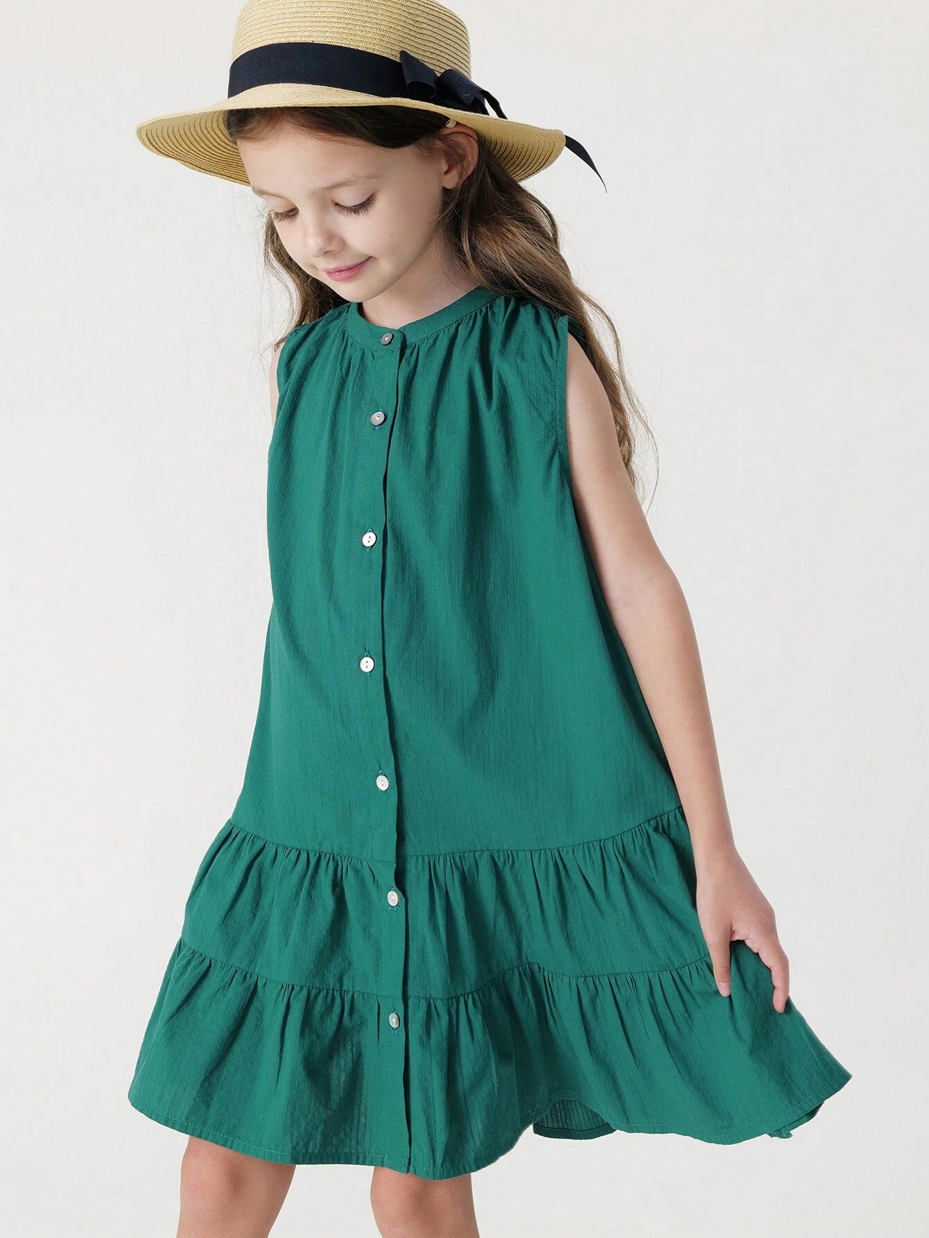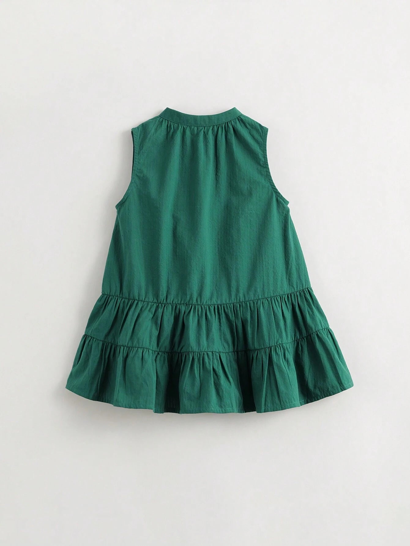 Color: Green Style: Cute Pattern Type: Plain Neckline: Round Neck Sleeve Length: Sleeveless Details: Ruffle Hem, Button...